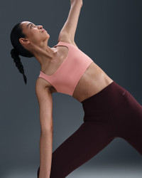 Stretch freely—this bra's InfinaSoft fabric gives you a gentle hold with lightweight softness that wicks sweat. A breathable liner offers subtle coverage while the open back invites plenty of airflow. Benefits - Nike Dri-FIT technology moves sweat away from your skin for quicker evaporation, helping you stay dry and comfortable. - Light support gives you a gentle hold with plenty of freedom that's great for low-impact workouts or all-day comfort. Product Details - Swoosh logo at back - Body: 63% nylon/37% spandex. Lining: 88% polyester/12% spandex. - Machine Wash - Imported - Shown: Rust Pink/White - Style: HQ3956-685 SIZE & FIT Model is wearing size S Model height: 5′11″180cm Model bust: 30″76cm Tight fit: snug and form-fitting Light support: feels ke a soft hug with plenty of freedom
