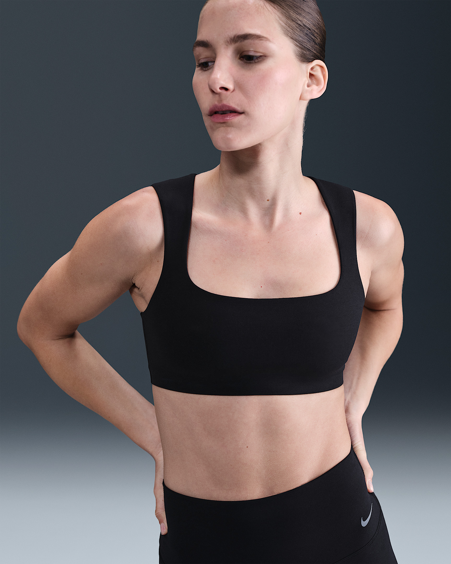 Stretch freely—this bra's InfinaSoft fabric gives you a gentle hold with lightweight softness that wicks sweat. A breathable liner offers subtle coverage while the open back invites plenty of airflow. Benefits - Nike Dri-FIT technology moves sweat away from your skin for quicker evaporation, helping you stay dry and comfortable. - Light support gives you a gentle hold with plenty of freedom that's great for low-impact workouts or all-day comfort. Product Details - Swoosh logo at back - Body: 63% nylon/37% spandex. Lining: 88% polyester/12% spandex. - Machine Wash - Imported - Shown: Black/Cool Grey - Style: HQ3956-010 SIZE & FIT Female model is wearing size S and is 5'10"178cm Tight fit: snug and form-fitting Light support: feels ke a soft hug with plenty of freedom