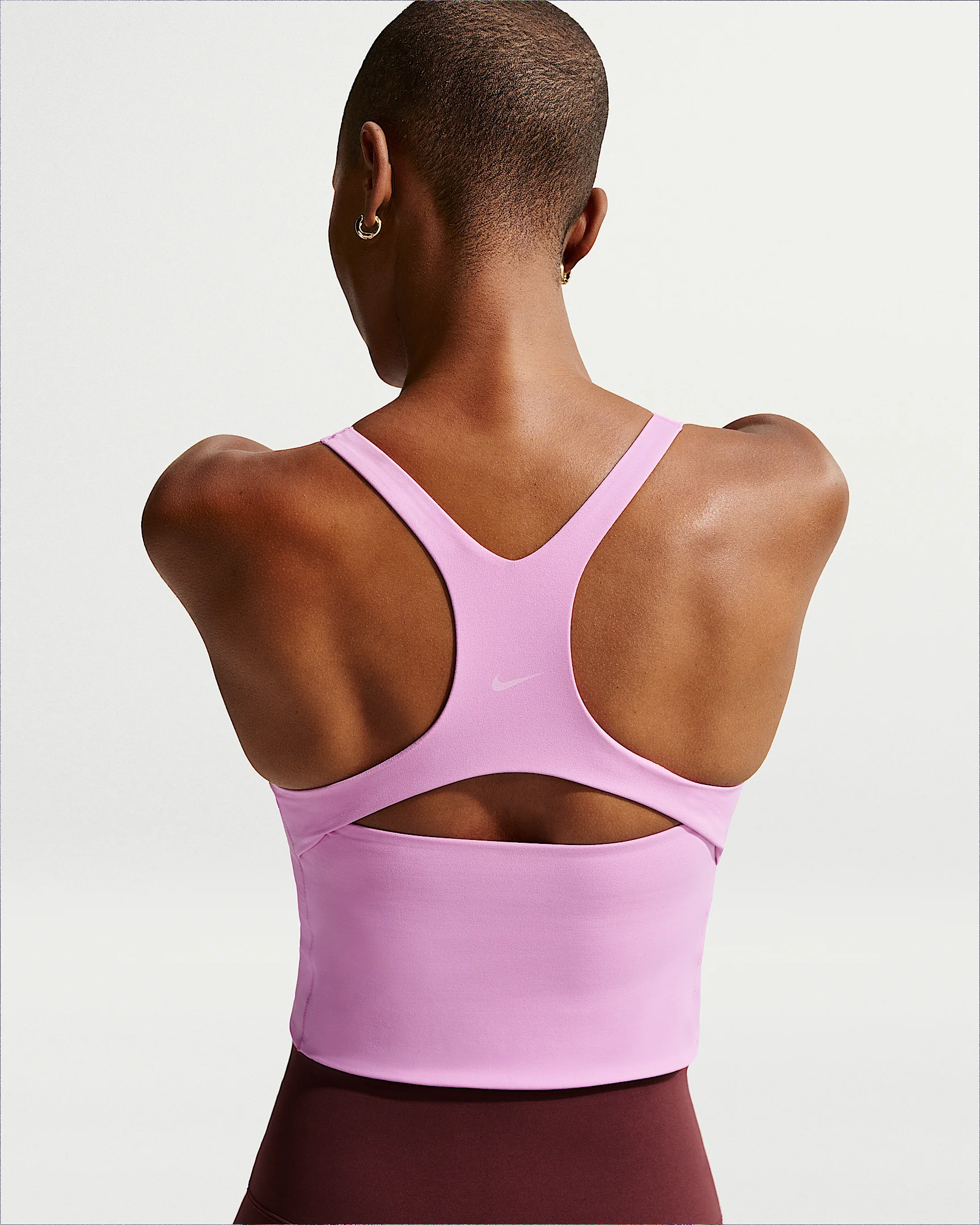 Bend and stretch in total confidence with this Zenvy bra tank. Still lightweight, its updated InfinaSoft fabric is now ultrasoft with stretch designed to recover its shape wear after wear. Light support with sewn-in pads gives you a gentle hold that's great for low-impact workouts and all-day comfort. Benefits - Nike Dri-FIT technology moves sweat away from your skin for quicker evaporation, helping you stay dry and comfortable. - Light support gives you a gentle hold with plenty of freedom that's great for low-impact workouts or all-day comfort. - Sewn-in pad offers subtle shaping and coverage without shifting or folding. Product Details - Body: 69% nylon/31% spandex. Panels lining: 88% polyester/12% spandex. Pad back fabric: 100% polyester. Pad: 100% polyurethane. - Machine wash - Imported - Shown: Light Magenta/White - Style: IB9872-503 SIZE & FIT Model is wearing size S Model height: 5'11"180cm Model bust: 34"86cm Tight fit: snug and form-fitting Light support: feels ke a soft hug with plenty of freedom