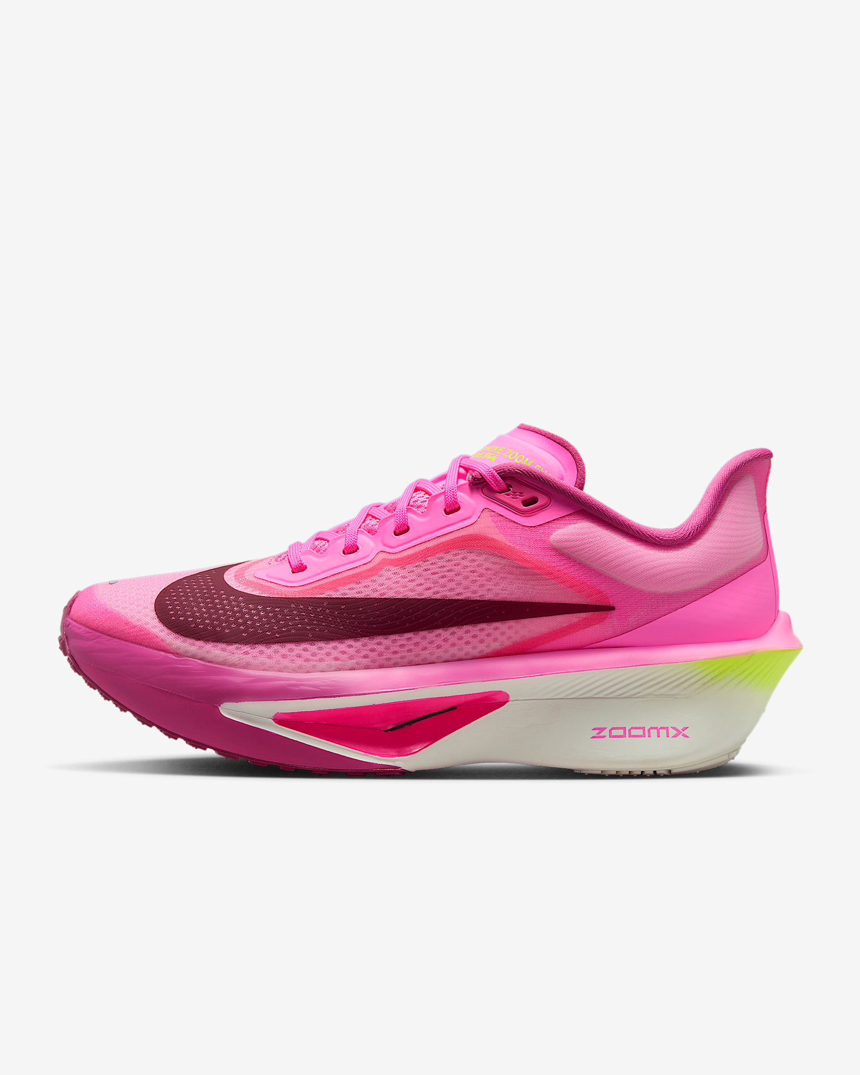 The Zoom Fly 6 is with you every step of your run. Lighter than the Zoom Fly 5, its responsive ZoomX foam adds energy return to each stride, while a carbon fiber Flyplate helps propel you to the finish line. Product Details - Weight: Approx. 214g/7.5oz (Women's US 8) - Heel-to-toe drop: 8mm - Reflective details - Not intended for use as Personal Protective Equipment (PPE) - Shown: Pink Spell/Crimson Tint/Hyper Pink/Bordeaux - Style: FN8455-602 SIZE & FIT Fits small; we recommend ordering a half size up
