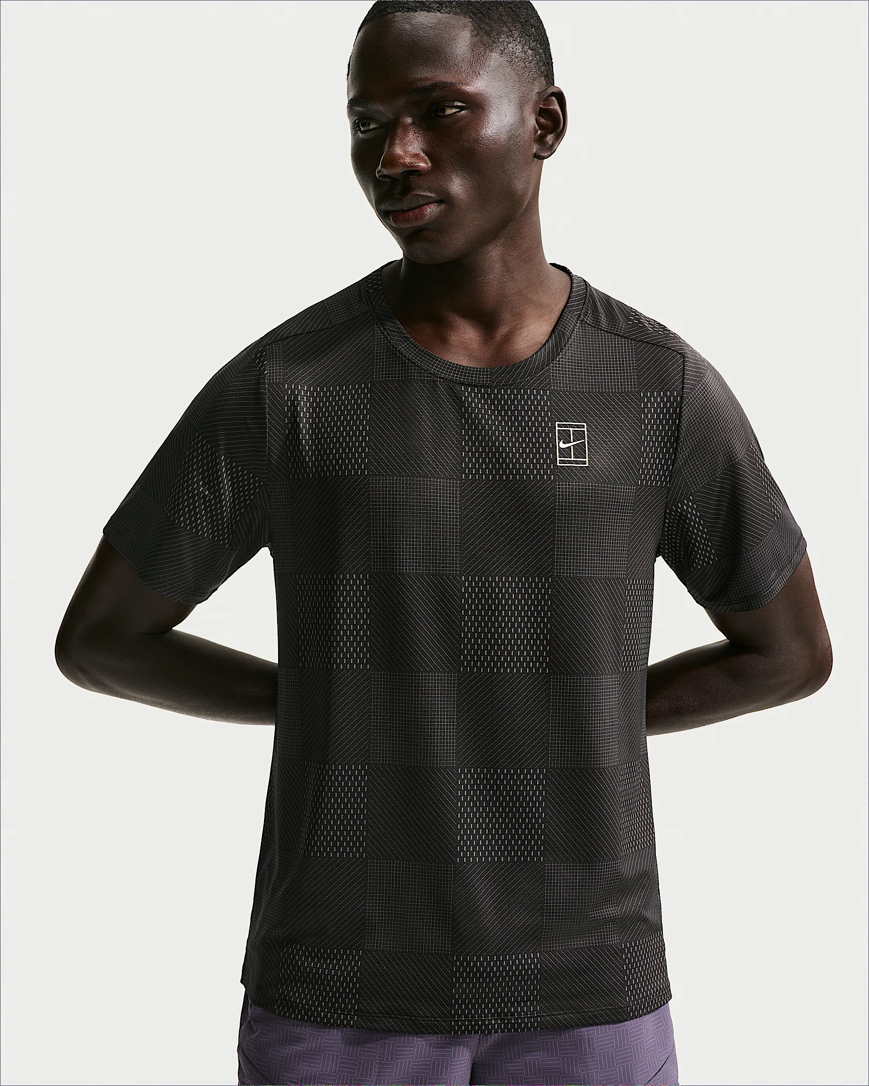 Don't sweat the small stuff. Cut with a slim fit and sweat-wicking fabric, this top helps cut out the distractions to help you stay focused on your match. Benefits - Nike Dri-FIT technology moves sweat away from your skin for quicker evaporation, helping you stay dry and comfortable. - Stretchy, breathable fabric feels lightweight and limits cling to your body. - Redesigned shoulder seams give you a smooth, natural feel through your swing with improved mobility in mind. - Longer back hem provides extra coverage. Product Details - Slim fit - Stretchy knit fabric - Extended back hem - 89% polyester/11% spandex - Machine wash - Imported - Shown: Black/White - Style: IB1064-010 SIZE & FIT Model is wearing size M and is 6'1"184cm Sm fit: sleek and tailored