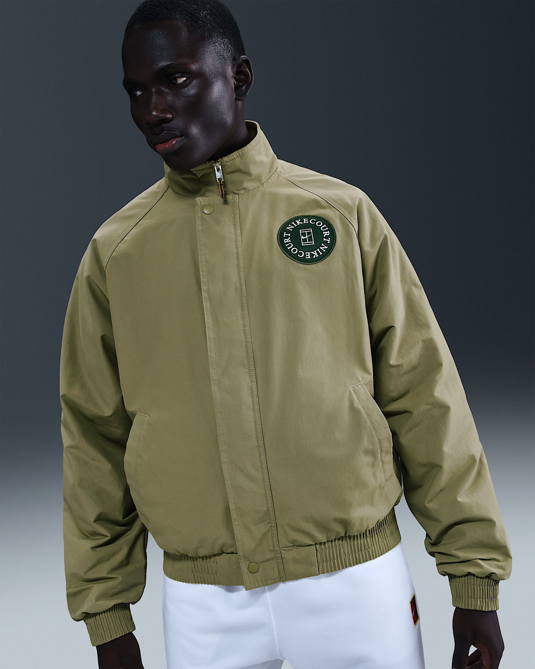 Keep your favorite tennis outfits toasty warm with the help of this relaxed-fit zip-up. Brushed fleece lining and a smooth woven shell make it the perfect option for cooler temperatures. Room through the body and sleeves lets you layer and move with ease. Benefits - Lightweight woven fabric feels soft and smooth. - Designed to feel roomy through the chest and body for casual style and easy layering. - Full-zip design with a full-length storm flap helps keep the cool air and moisture out. Product Details - Body: 60% cotton/40% nylon. Lining: 100% polyester. - Stand collar - Fold-over elastic hem and cuffs - Storm flap with snap closure - Front snap-button placket - Woven twill patch with embroidered NikeCourt graphic - Machine wash - Imported - Shown: Neutral Olive/Fir - Style: HQ1744-276 SIZE & FIT Loose fit: roomy and relaxed