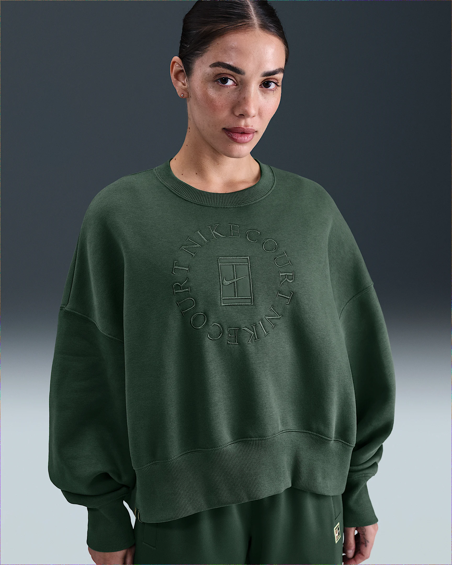 Embroidered graphics and exaggerated finishes elevate this comfy courtside layer. It's made with fleece that's extra soft on the inside and smooth on the outside, helping you stay cozy while keeping its structured shape. Benefits - Extra-wide ribbing adds structure and a dramatic finish. - Dropped shoulders and roomy sleeves enhance the extra-spacious fit. Product Details - Embroidered NikeCourt graphic on chest - Body: 80% cotton/20% polyester. Rib: 97% cotton/3% spandex. - Machine wash - Imported - Shown: Fir/Cosmic Bonsai - Style: HJ8988-323 SIZE & FIT Oversized fit: exaggerated and spacious