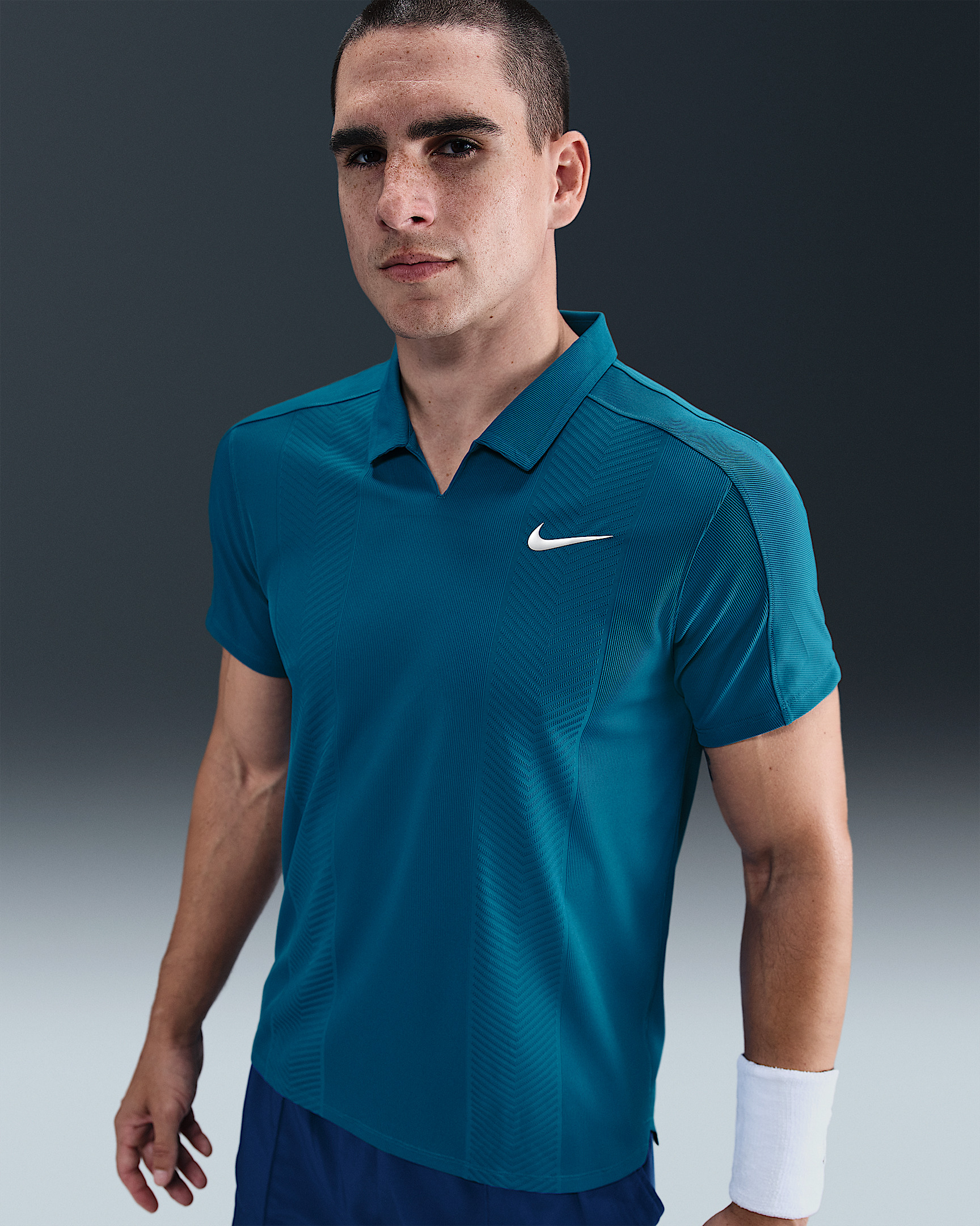 This polo's simplified buttonless collar and strategically placed shoulder seams help you swing freely. As the intensity rises, advanced sweat-wicking technology helps you stay cool in the moment. Benefits - Nike Dri-FIT ADV levels up our sweat-wicking technology with advanced cooling and zones of breathability to help you stay dry and comfortable. - Lightweight four-way stretch material limits cling to your body. - Shoulder seams are moved forward and wrapped through the upper back to help you swing naturally. - Extended back hem provides extra coverage when bending or reaching. - Bonded hems replace traditional sewn hems to create a smooth fit with less potential for chafing. Product Details - 100% polyester - Machine wash - Imported - Shown: Green Abyss - Style: HM6752-301 SIZE & FIT Model is wearing size M and is 6′2″188cm Sm fit: sleek and tailored