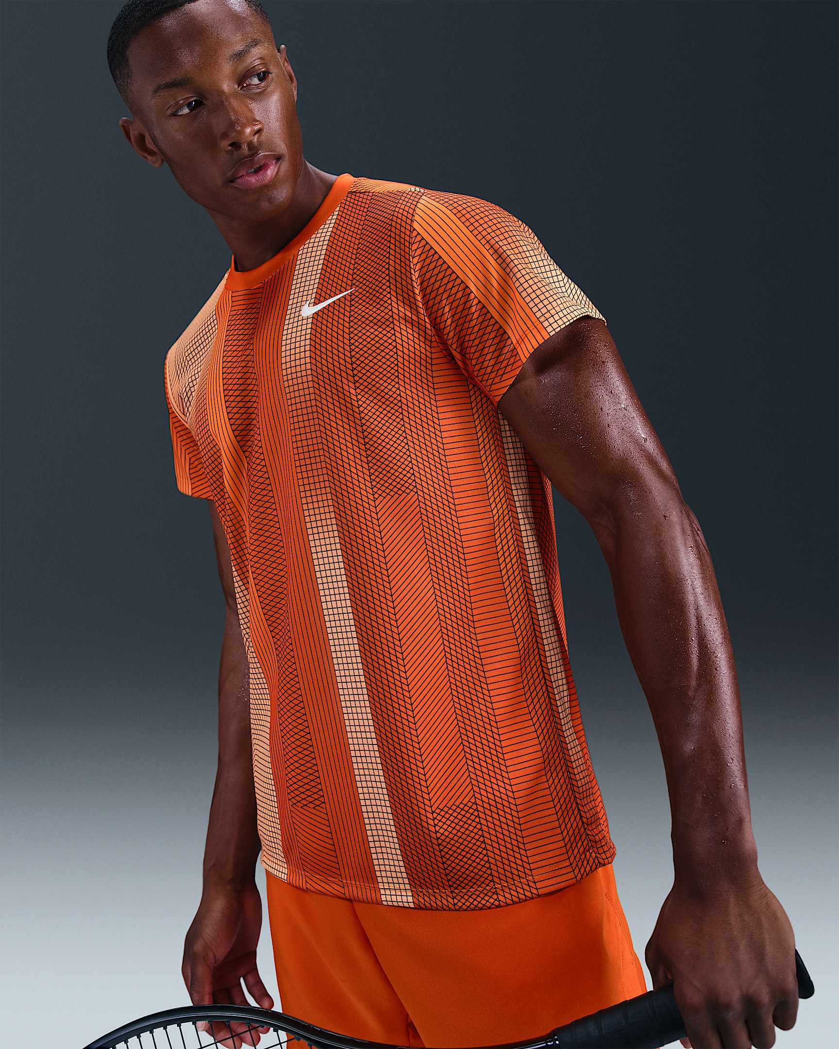 Breathable, stretchy and sweat-wicking, the Victory top is always ready to hit the court. The back shoulder seam placement is designed to stay out of the way while you rotate and drive through the ball. Benefits - Nike Dri-FIT technology moves sweat away from your skin for quicker evaporation, helping you stay dry and comfortable. - Soft and breathable, this smooth knit helps you stay cool and comfortable. - Offset seam construction on the back helps with range of motion through your shot. Product Details - Embroidered Swoosh logo - 100% polyester - Machine wash - Imported - Shown: Campfire Orange/White - Style: HM6505-893 SIZE & FIT Standard fit: easy and traditional