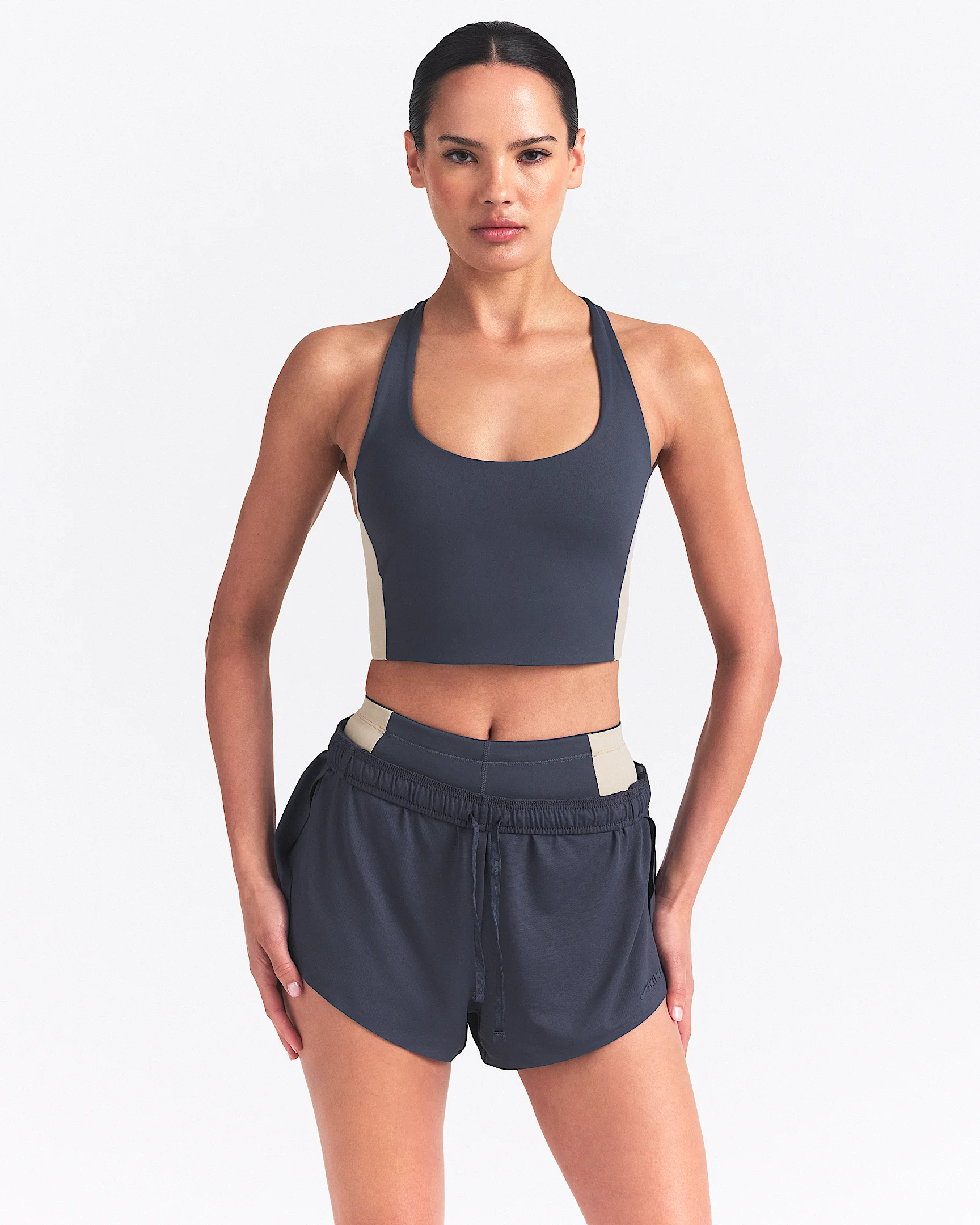 With the sculpting power of Matte and the sleek look of Shine, this medium-support bra offers the best of both worlds. Crafted from sweat-wicking and quick-dry fabrics, it features soft molded inserts for comfortable coverage. Strong, flexible power mesh provides a supportive feel ideal for low-impact activities. Benefits - Lightweight, sculpting Matte fabric on the front and back moves sweat away from your skin for quick evaporation, helping you stay dry and comfortable. - Our smoothing, quick-dry Shine fabric on the side panels adds eye-catching contrast. - Medium support gives you a snug hold that helps keep everything in place. - Brushed elastic on the interior chest band adds a soft touch for a comfortable fit. Product Details - Four-way stretch - Pullover style - Racerback design - Silicone matte logo - Body: 83% nylon/17% Lycra® spandex. Panels: 78% polyamide/22% spandex. - Machine wash - Imported - Shown: NSKM DEEP ROYAL/NSKM STONE - Style: BABRA9708W-DEO SIZE & FIT Model is wearing size XS Model height: 5'9"175cm Model bust: 32"81cm Tight fit: snug and form-fitting Medium support: feels ke a snug hold to keep everything in place