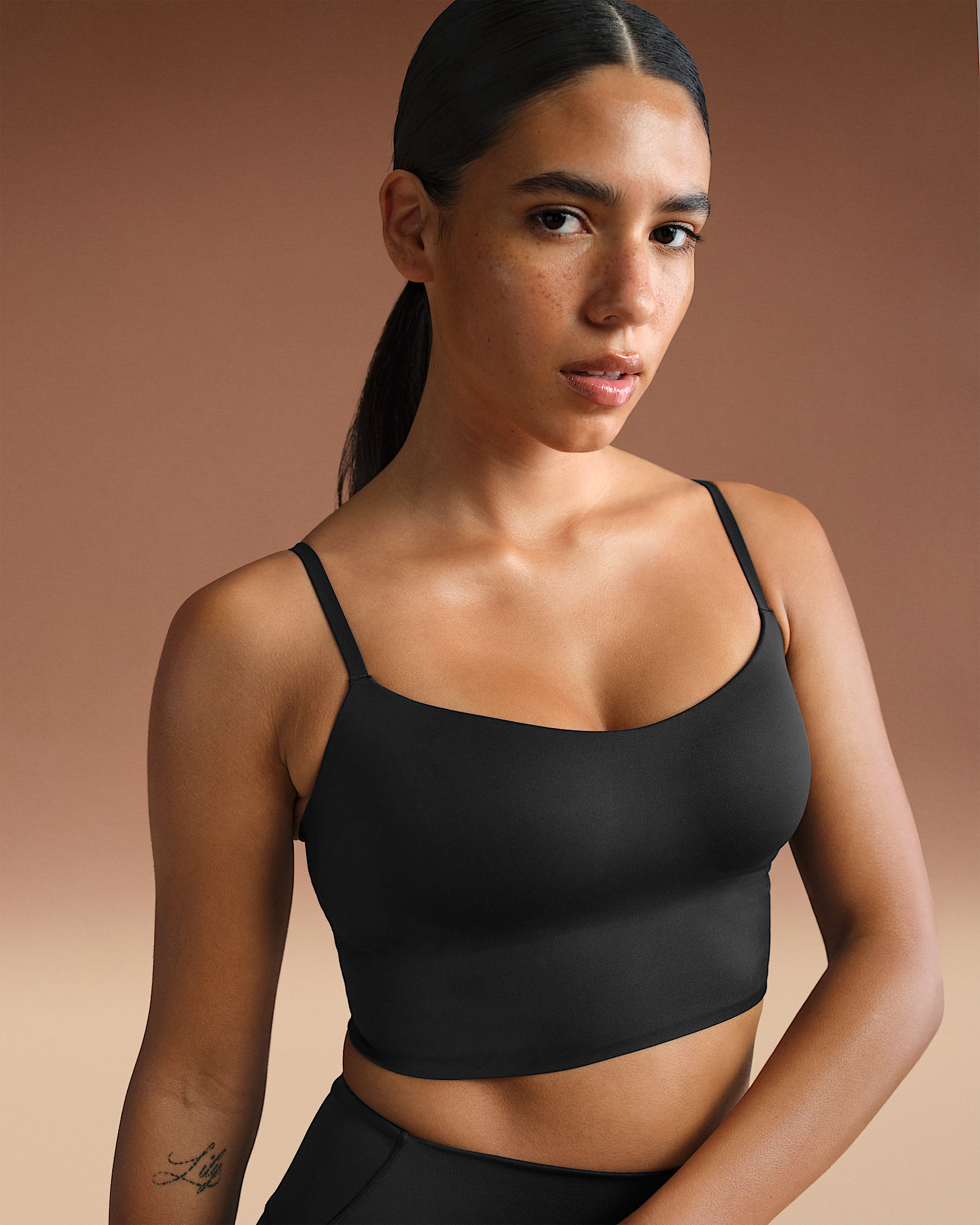 This bra lifts and enhances with wireless contoured pads and adjustable straps for light support. We designed it with our sculpting Matte fabric, sweat-wicking technology and longline coverage to make it a studio essential you can wear anywhere. Benefits - Our soft Matte fabric is designed to sculpt and smooth. - Nike Dri-FIT technology moves sweat away from your skin for quicker evaporation, helping you stay dry and comfortable. - Mesh lining helps add breathability. - Long-line design provides added coverage and support. - Adjustable straps help you personalize your fit. - Wireless contoured pads lift and enhance. Product Details - Pullover style - Four-way stretch - Scoop neck - Silicone matte logo at center back - 83% polyamide/17% Lycra® spandex - Machine wash - Imported - Shown: NSKM Obsidian - Style: BRSPT5115-OBD SIZE & FIT Model 1 is wearing size S with a bust size of 33"84cm Model 2 is wearing size 2X with a bust size of 51"130cm Tight fit: snug and form-fitting Light support: feels ke a soft hug with plenty of freedom
