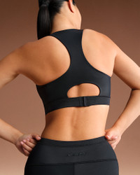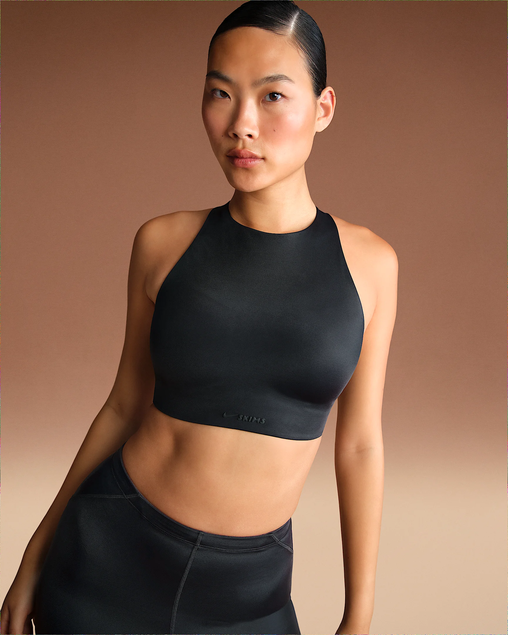 Designed to feel luxuriously light, our quick-drying Shine fabric gives this high-support bra a sleek look with subtle sheen. Built-in pads work with a racerback design, high neck and internal bonded panels to provide extra support and coverage. Benefits - Our sleek Shine fabric is lightweight and breathable with a smoothing fit and subtle sheen. - Thin, built-in pads mold to your body for comfortable coverage. - Mesh lining and a cutout at the lower back add breathability. Product Details - Hook-and-eye closure - Silicone matte logo at center front - 78% nylon/22% spandex - Machine wash - Imported - Shown: NSKM Obsidian - Style: BRSPT7004W-OBD SIZE & FIT Model 1 is wearing size 34C with a bust size of 32"81cm Model 2 is wearing size 40D with a bust size of 40"102cm Tight fit: snug and form-fitting High support: feels ke locked in support that keeps motion to a minimum