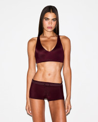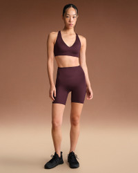Designed to feel luxuriously light, our quick-drying Shine fabric gives this V-neck bra a sleek look with subtle sheen. Offering light support, it features lightly molded, built-in pads for coverage. The racerback design and adjustable straps finish the look. Benefits - Our sleek Shine fabric is lightweight and breathable with a smoothing fit and subtle sheen. - Adjustable straps help you personalize your fit. - Racerback design allows for comfortable, unrestricted movement. - Lightly molded, built-in pads give you coverage and support. Product Details - Pullover style - Elastic underband - Silicone matte logo at center front - 78% polyamide/22% spandex - Machine wash - Imported - Shown: NSKM CURRANT - Style: BRSPT5191W-CUR SIZE & FIT Model 1 is wearing size S with a bust size of 32"81cm Model 2 is wearing size 2X with a bust size of 44"112cm Tight fit: snug and form-fitting Light support: feels ke a soft hug with plenty of freedom