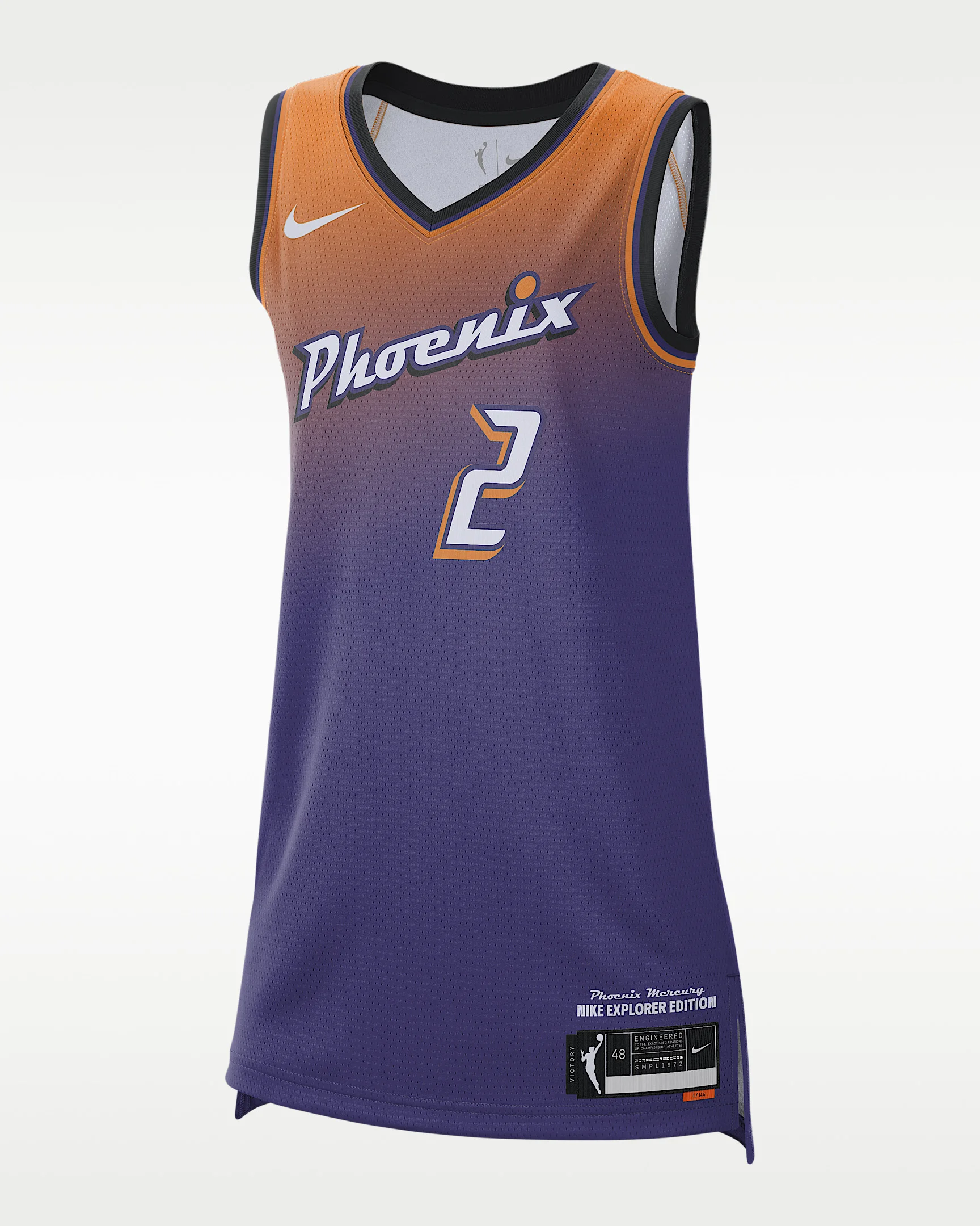 The Nike WNBA Explorer Edition Victory Jersey of the Phoenix Mercury represents the team's city and features that make it unique. It's made from double-knit mesh with sweat-wicking technology. The jersey features purple and orange in flowing, gradient color. This product is made with 100% recycled polyester fibers. Product Details - Loose fit for a roomy feel - Ribbed neckline and armholes - Heat-applied graphics - Sewn-on jock tag - 100% polyester - Machine wash - Imported - Shown: New Orchid/Clay Orange - Style: DC9575-569 SIZE & FIT Loose fit: roomy and relaxed