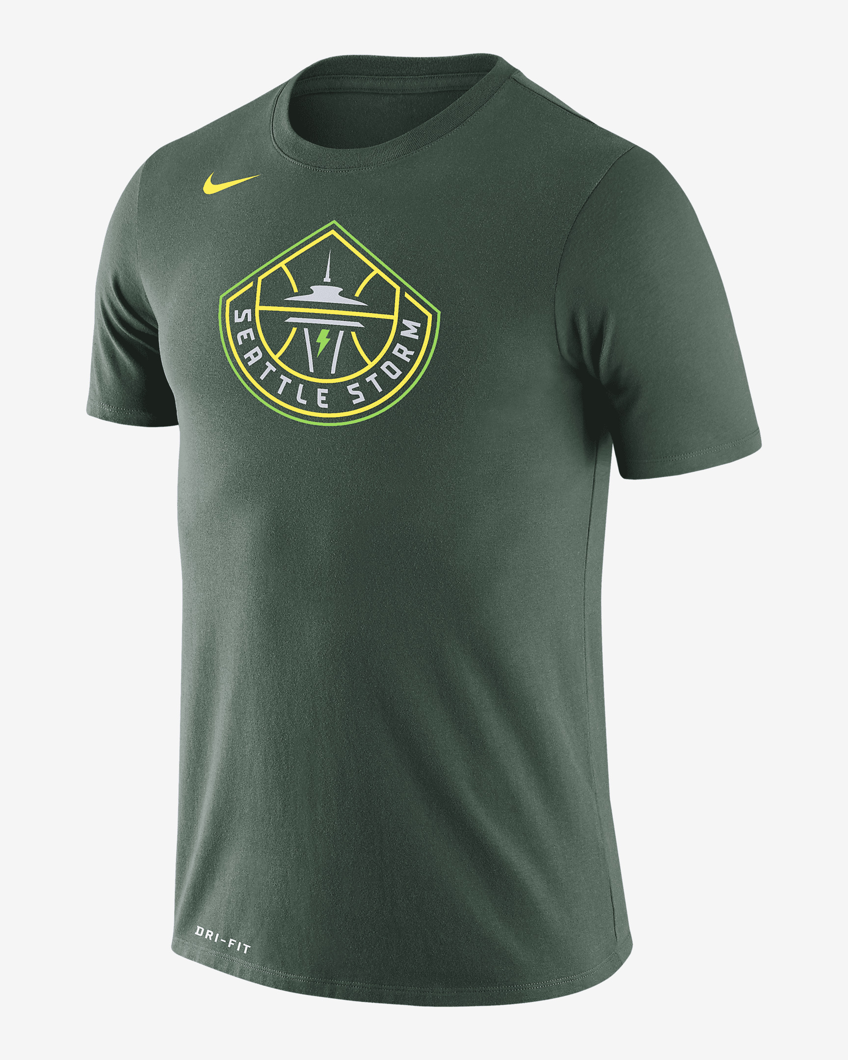 Rep your team in the Seattle Storm Logo Nike WNBA T-Shirt. It's made with soft, lightweight fabric and sweat-wicking technology. Benefits - Dri-FIT technology helps you stay dry and comfortable. - Blended knit fabric feels soft and lightweight. Product Details - Standard fit for a relaxed, easy feel - Ribbed neckband - Printed graphics - 57% cotton/43% polyester - Machine wash - Imported - Shown: Fir - Style: DD3648-323 SIZE & FIT Standard fit: easy and traditional