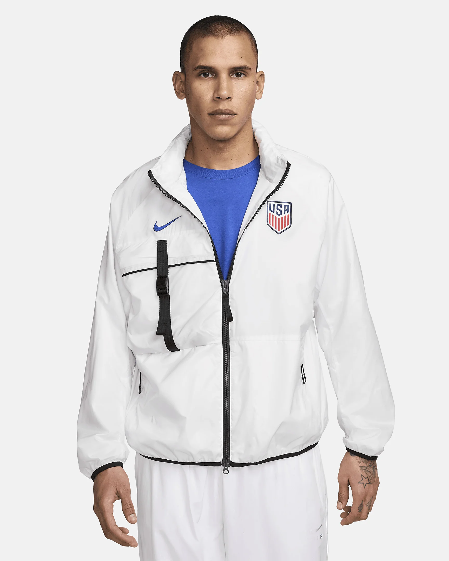 Stand with your country in this USMNT jacket. With smooth ripstop fabric and mesh lining, it's lightweight and breathable while remaining durable. A stow-away hood is zippered into the collar with bungee adjustment for on-demand coverage from the elements. Benefits - Front utility pocket with buckle closure and zippered hand pockets give you secure spots to store your daily essentials. - Jacket packs down into pocket for easy, on-the-go storage. - Designed to feel relaxed through the shoulders, chest and body provide an athletic fit you can layer. Product Details - Body/Lining/Mesh: 100% polyester - Machine wash - Imported - Shown: Summit White/Old Royal - Style: FZ8367-121 SIZE & FIT Model is wearing size M and is 6′1″185cm Loose fit: roomy and relaxed