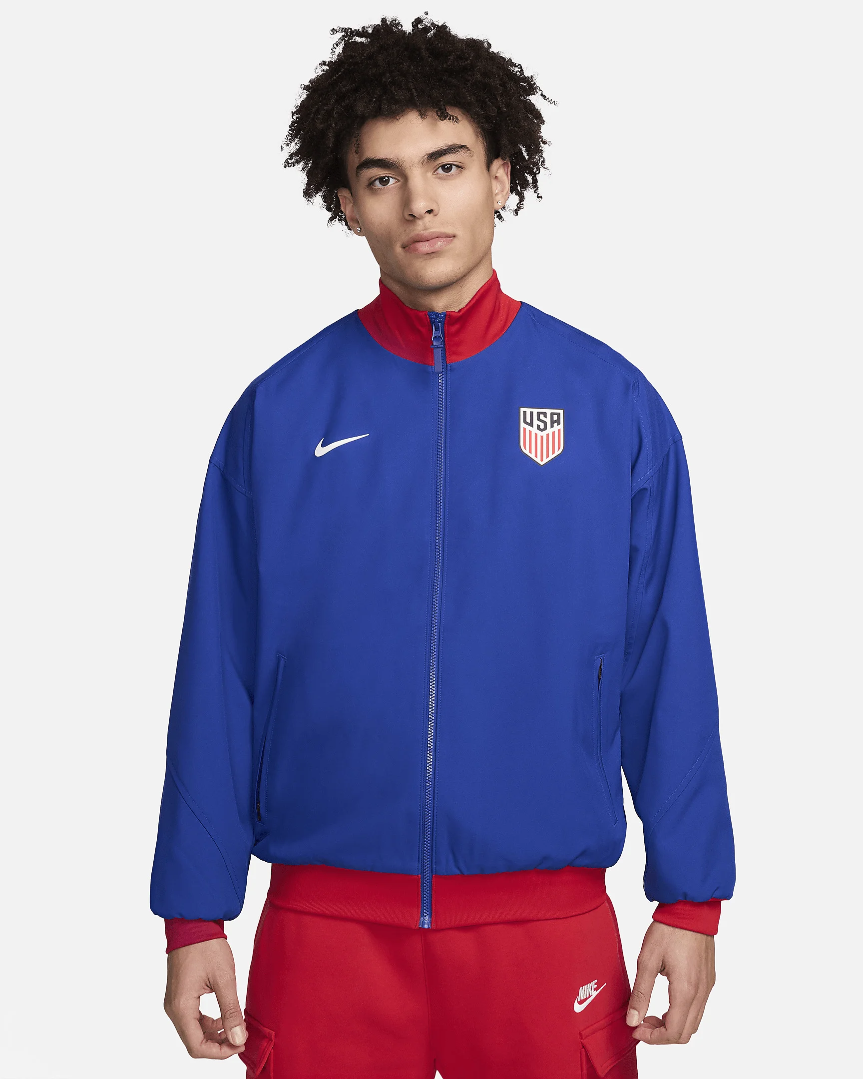 This USMNT jacket is a zip-up design you can wear while warming up cheering on your favorite team. With design details specifically tailored for soccer’s rising stars, a loose fit works together with sweat-wicking technology to help keep you cool and composed while you fine-tune your skills. Benefits - Nike Dri-FIT technology moves sweat away from your skin for quicker evaporation, helping you stay dry and comfortable. - Ribbed cuffs and hem help keep the jacket in place while you move. Product Details - Side pockets - Body/Lining: 100% polyester - Machine wash - Imported - Shown: Old Royal/Sport Red/White - Style: FJ2910-417 SIZE & FIT Model is wearing size M and is 6′1″185cm Loose fit: roomy and relaxed
