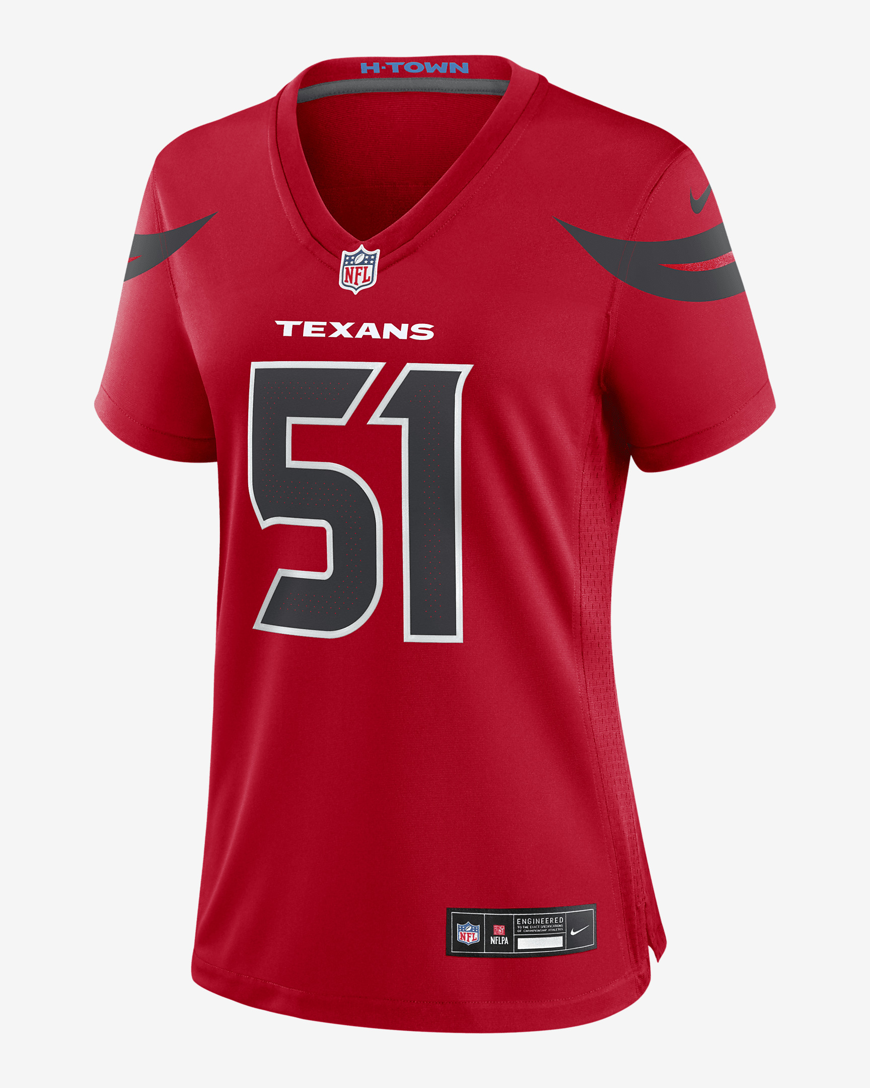 Rep one of your team's top stars with this Houston Texans Jersey. Proper ventilation and a form fit help provide a dry, comfortable wear with the authentic look of the on-field uniform. Benefits - Screen-printed name, number and team mark offer lightweight durability. - Ventilation over major heat zones helps keep you cool. Product Details - Standard fit for a relaxed, easy feel - NFL shield at V-neck - Tagless neck label - Woven jock tag - 100% polyester - Machine wash - Imported - Shown: Red - Style: 67NW0B9G9HF-D1C