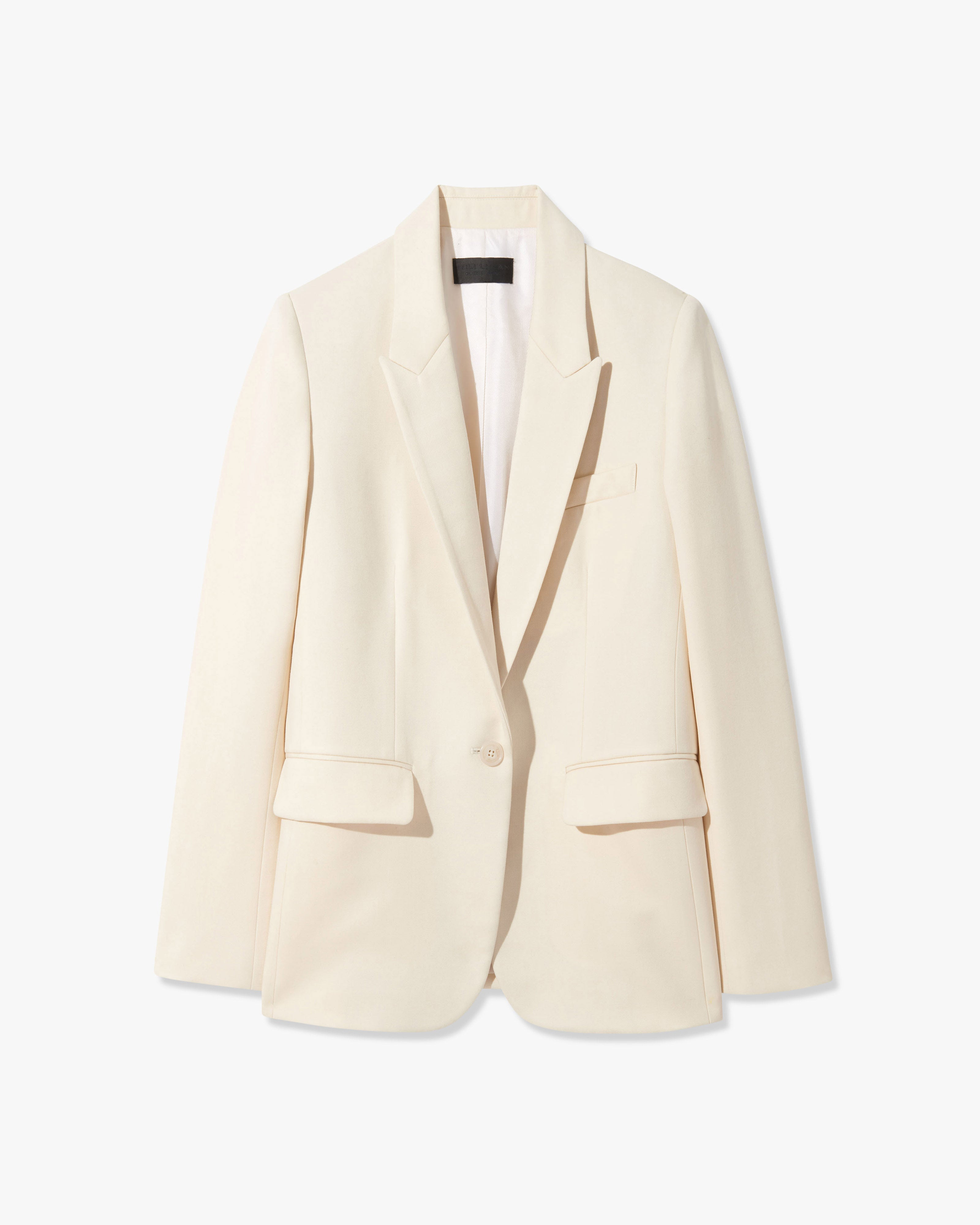 Modern oversized jacket, slimmed down and trimmed up. Italian wool gabardine selected for its excellent drape. Single breasted. Fully constructed. Peak lapels. Single button closure. Chest welt and flap pockets. Center back vent. Fully lined . Made in USA COMPOSITION & CARE 100% VIRGIN WOOL, MADE IN USA OF IMPORTED FABRIC DRY CLEAN ONLY
