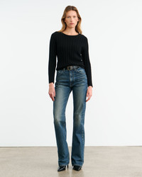 Fine to medium weight relaxed wide rib knit sweater. Open neckline. Saddle shoulder. Fashioning details along arm hole. Rib trim at hem and sleeve. Normal length. - 90% Merino Wool, 10% Cashmere - Dry clean recommended