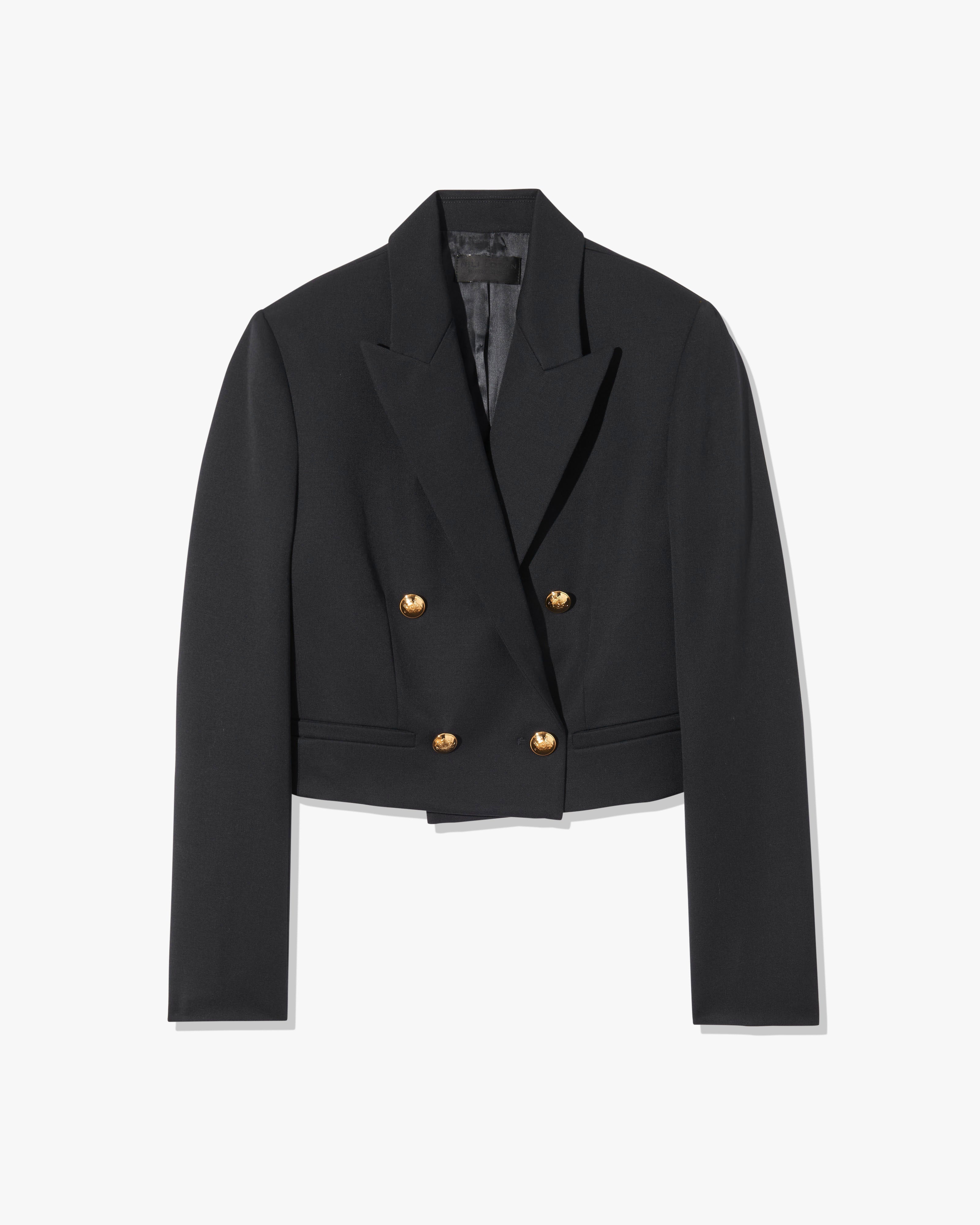 Tailored, slim cropped double breasted jacket in Italian wool gabardine. Signature crest buttons in gold at center front and sleeve. Soft structured shoulder pads. Non-functional front slash pockets. Front darts. COMPOSITION & CARE 100% Virgin Wool Dry clean only