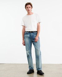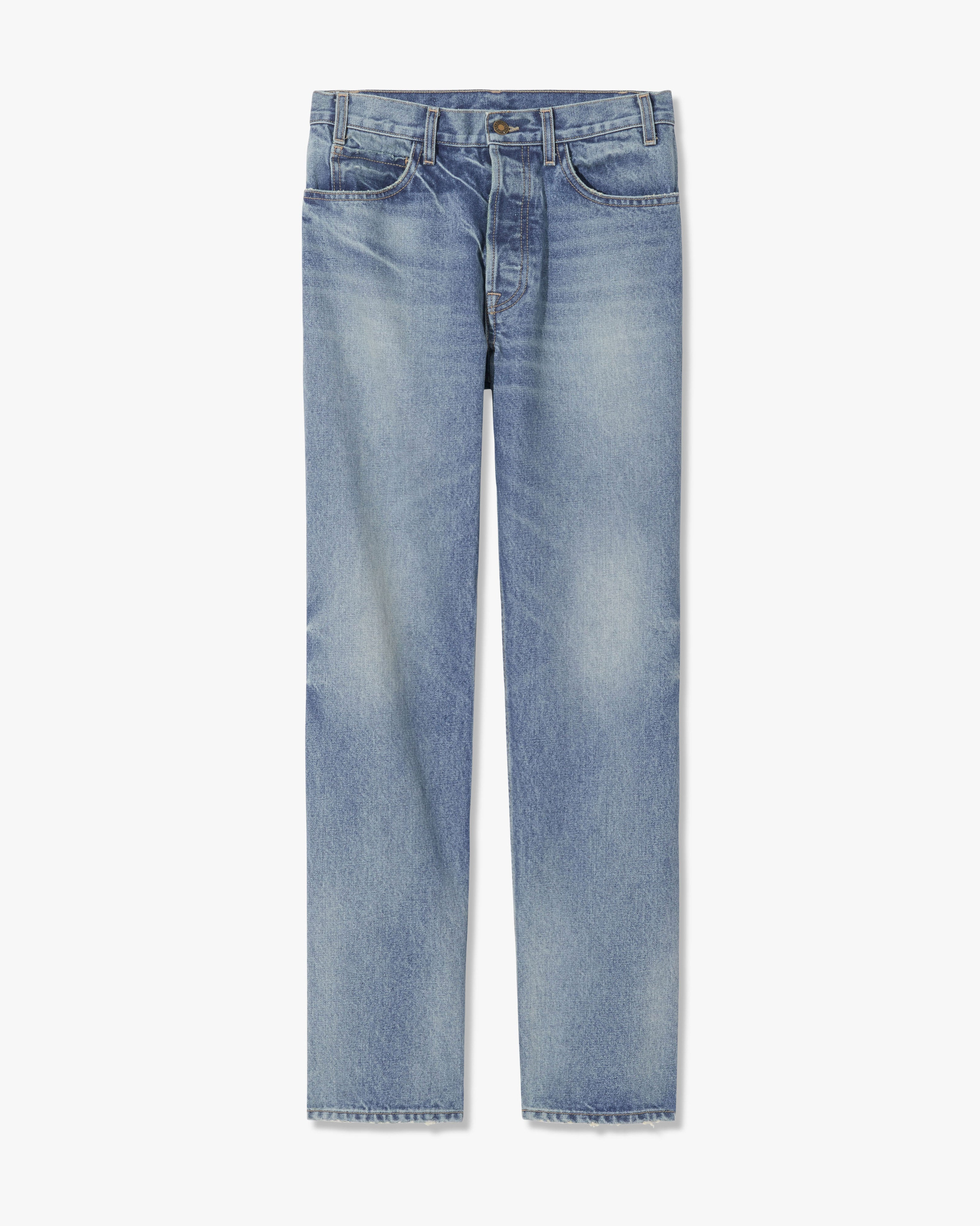 Mid-rise straight leg jean Japanese crosshatch denim. Five pocket details. Zip fly. Shank closure. Belt loops. Designed for a 32" inseam—tailor for a personalized fit. Made in USA COMPOSITION & CARE 100% Cotton Machine wash cold Do not bleach Do not tumble dry Low iron