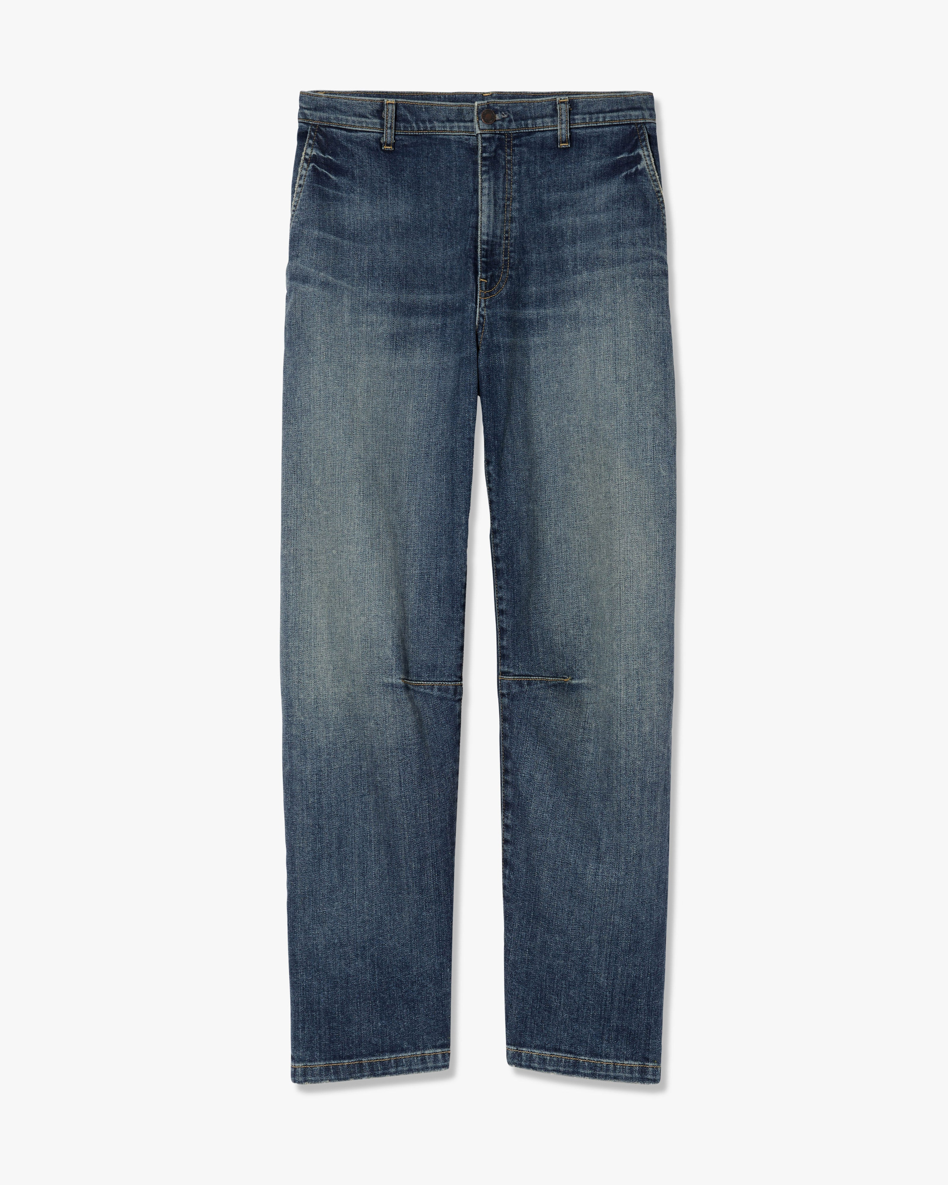 Mid-rise relaxed fit jean in Japanese stretch denim. Uniquely curved silhouette. Seam detail at knees. Gusset at inseam. Side slash pockets. Hammer loop. Back welt pockets. Zip fly. Button closure. Belt loops. Made in USA COMPOSITION & CARE 98% COTTON 2% POLYURETHANE DO NOT BLEACH MACHINE WASH COLD TUMBLE DRY LOW DO NOT DRY CLEAN