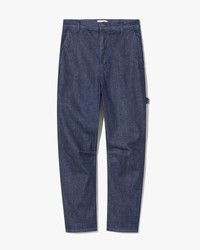 Barrel-legged pant in heavyweight Japanese black sulfur-dyed denim. Zip fly with jean shank closure at front. Slash pockets at front. Patch pockets at back. Hammer loop at back thigh. Stone-washed for a rich charcoal base shade and hand-sanded with a natural wear pattern for a well-worn appearance. Designed for a 27" inseam. - Made in USA - 98% Cotton, 2% Polyurethane - Do not bleach - Machine wash cold - Tumble dry low - Do not dry clean