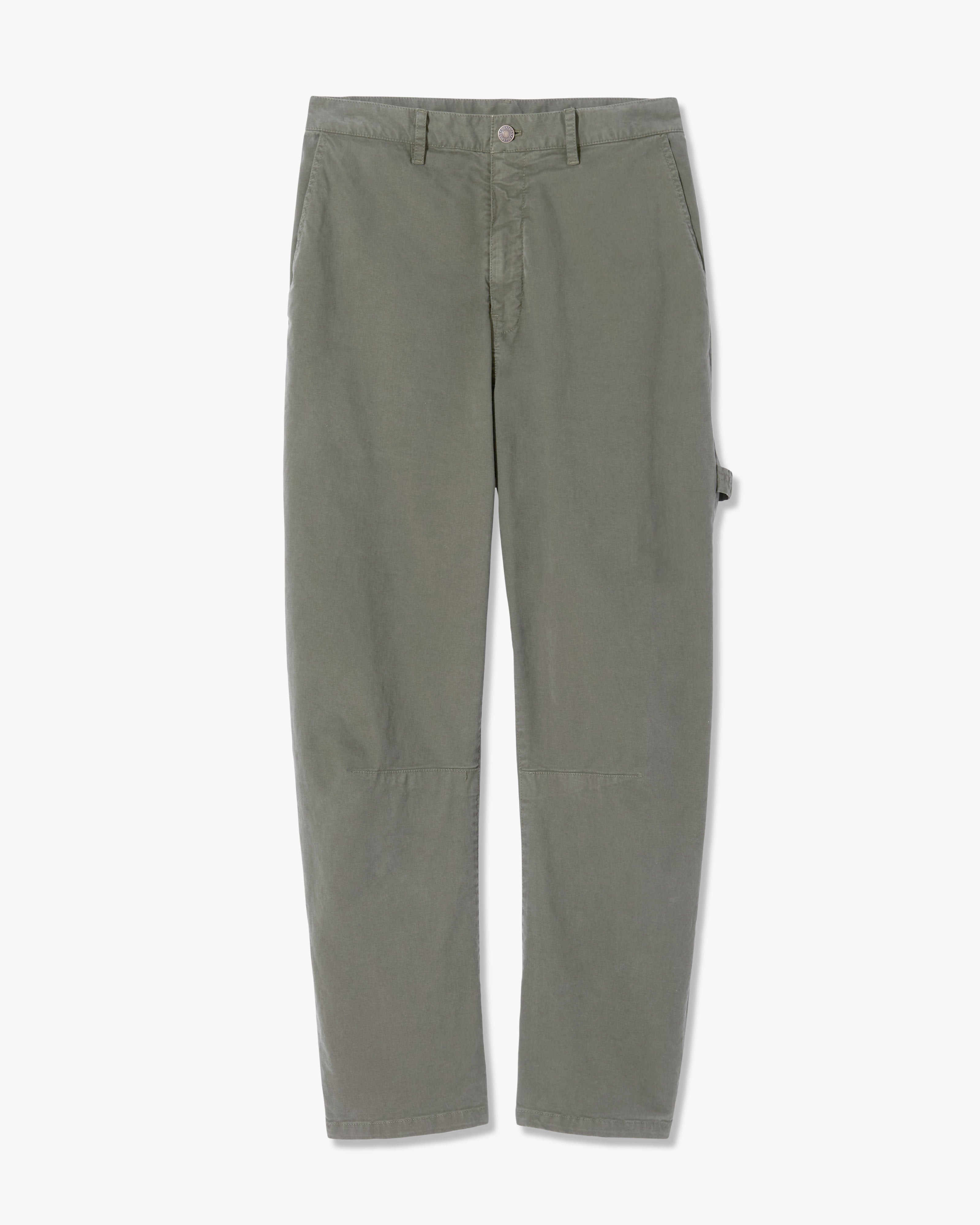 Flat front, boxy bowed leg pant emphasized by darts. Left utility strap. Front slash pockets. Back patch pockets. Fully constructed front zip. Horn button closure. Belt loops. Designed for a 26.5" inseam. - Made in USA - 98% Cotton, 2% Elastane - Machine wash cold - Low iron - Dry clean recommended