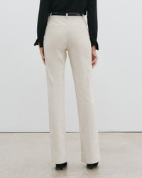 Flat front, high-rise straight leg trouser. Fitted through hips. Zip fly. Hidden hook-and-bar closure. Hidden stay button closure. Belt loops. Back welt pockets. Designed for a 35" inseam. - Made in USA - 100% Cotton - Machine wash cold - Do not bleach - Do not tumble dry - Lay flat to dry - Do not dry clean
