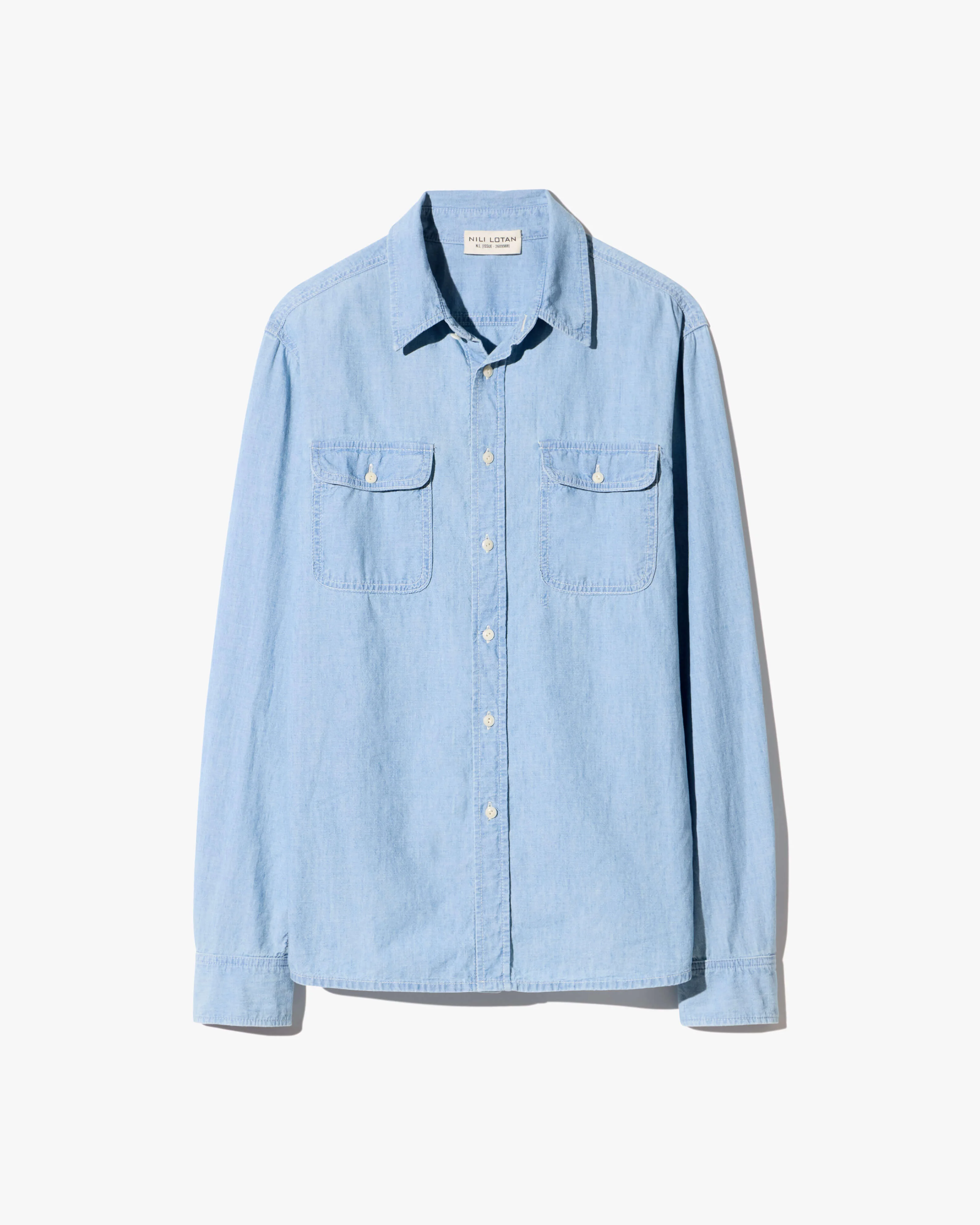 Oversized shirt jacket in Japanese chambray with patch front pockets. Longer body and dropped shoulders for a relaxed fit. - Made in USA - 100% Cotton - Machine wash cold - Do not bleach - Line dry - Medium iron - Do not dry clean