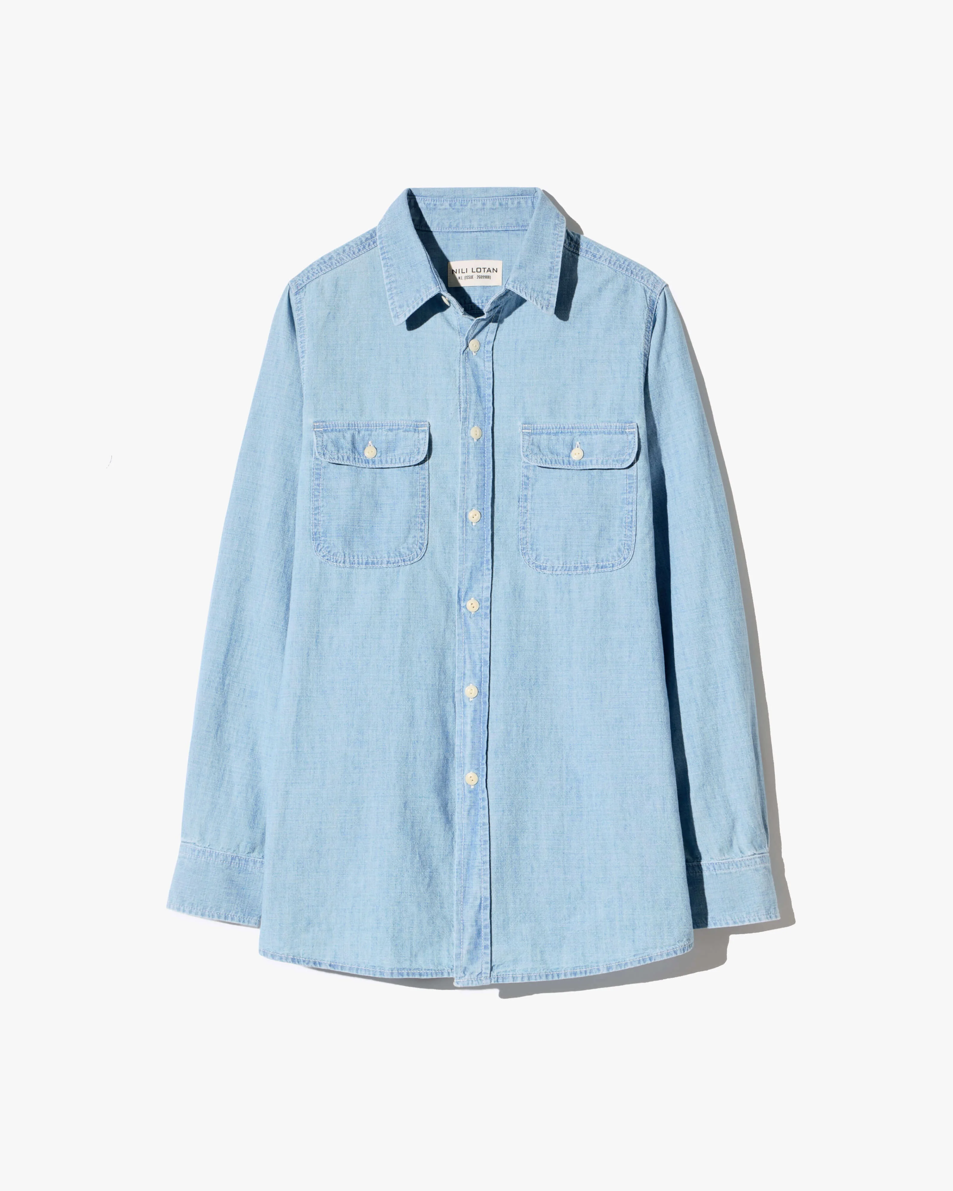 Relaxed-fit button down shirt in light-weight Japanese indigo chambray. Slightly exaggerated body length. Buttoned center front placket, chest pockets, and sleeve cuff. Classic shirt-tail hem. Off-white colored topstitching and workwear-inspired details throughout. True to size. Model is 5'10 and wearing size Small. Designed for a relaxed, easy fit.