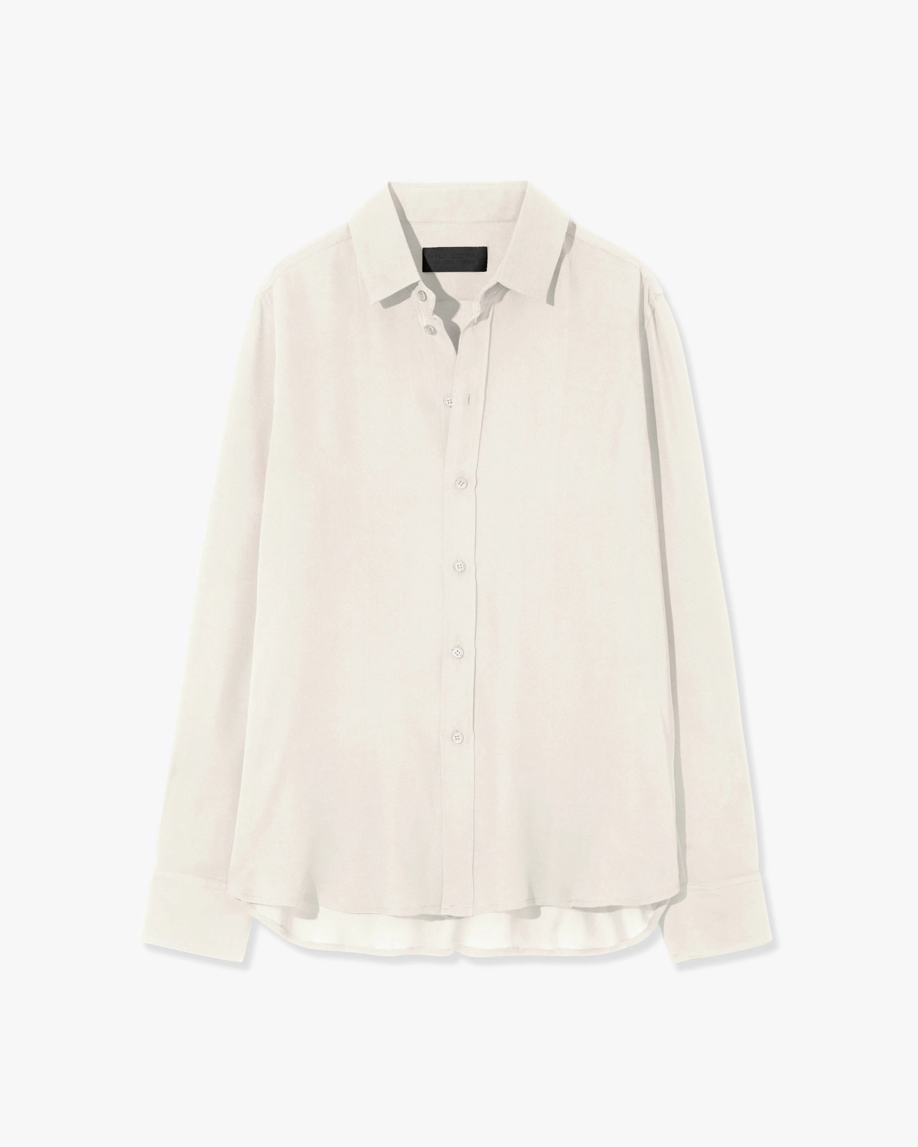 Classic long sleeve collared button up shirt in tumbled crepe de chine silk. Straight, slim body. Back yoke. Classic placket details. Dyed to match logo buttons. Made in USA COMPOSITION & CARE 100% Silk Dry clean only Low iron