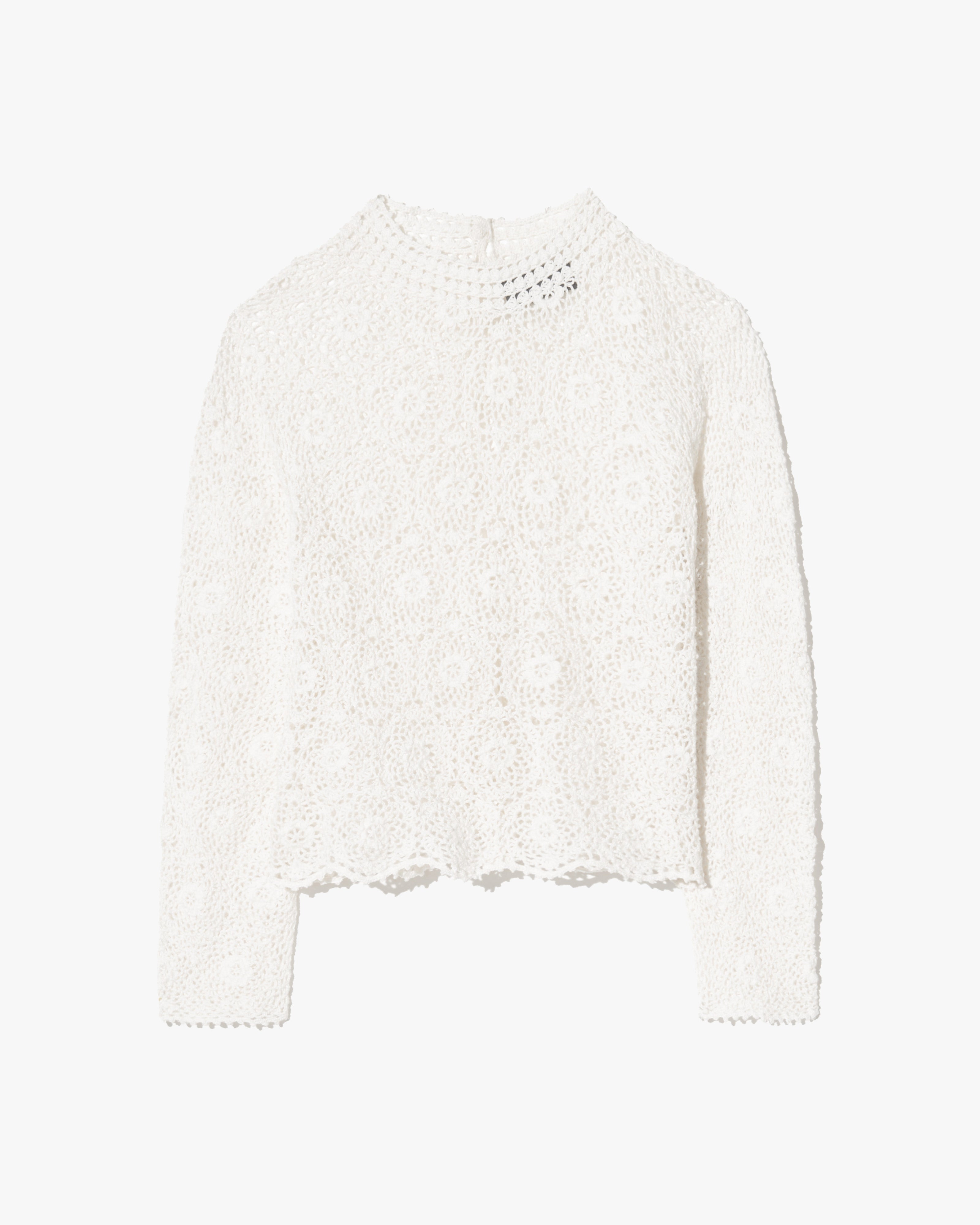 Button up top in Peruvian cotton. Custom circular floral crochet. Completed by hand. Mock neck. Scallop detail. Bauble detail at hem. Buttons down the back. COMPOSITION & CARE 100% Cotton Dry clean recommended
