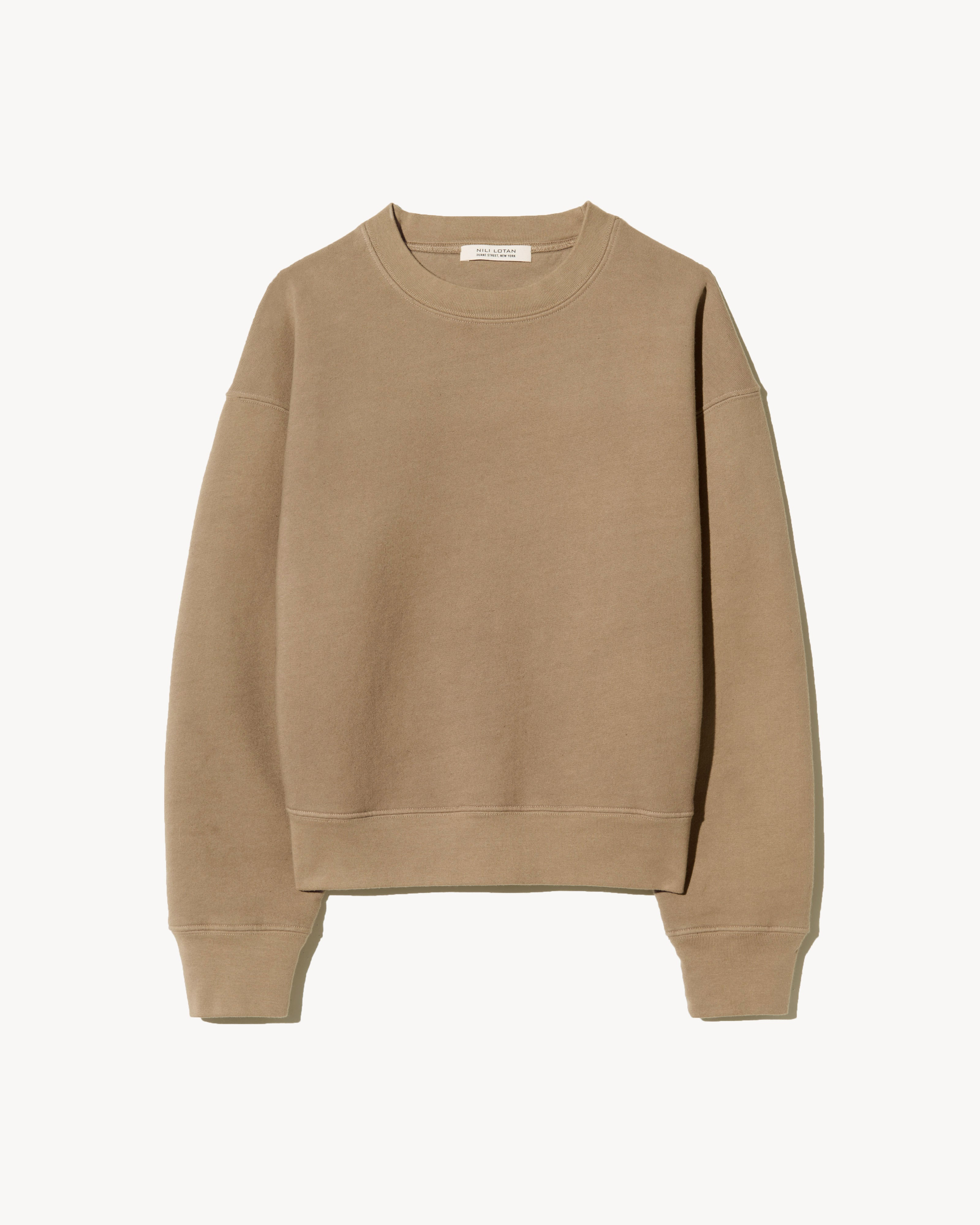 Long sleeve crewneck sweatshirt. Boxy fit. Short length. Regular length sleeve. Rib combo at sleeve, hem, and neck. Cover stitch detail at sleeve, hem, and neck. - Made in USA - 100% Cotton - Low iron - Machine wash cold - Do not bleach - Tumble dry low