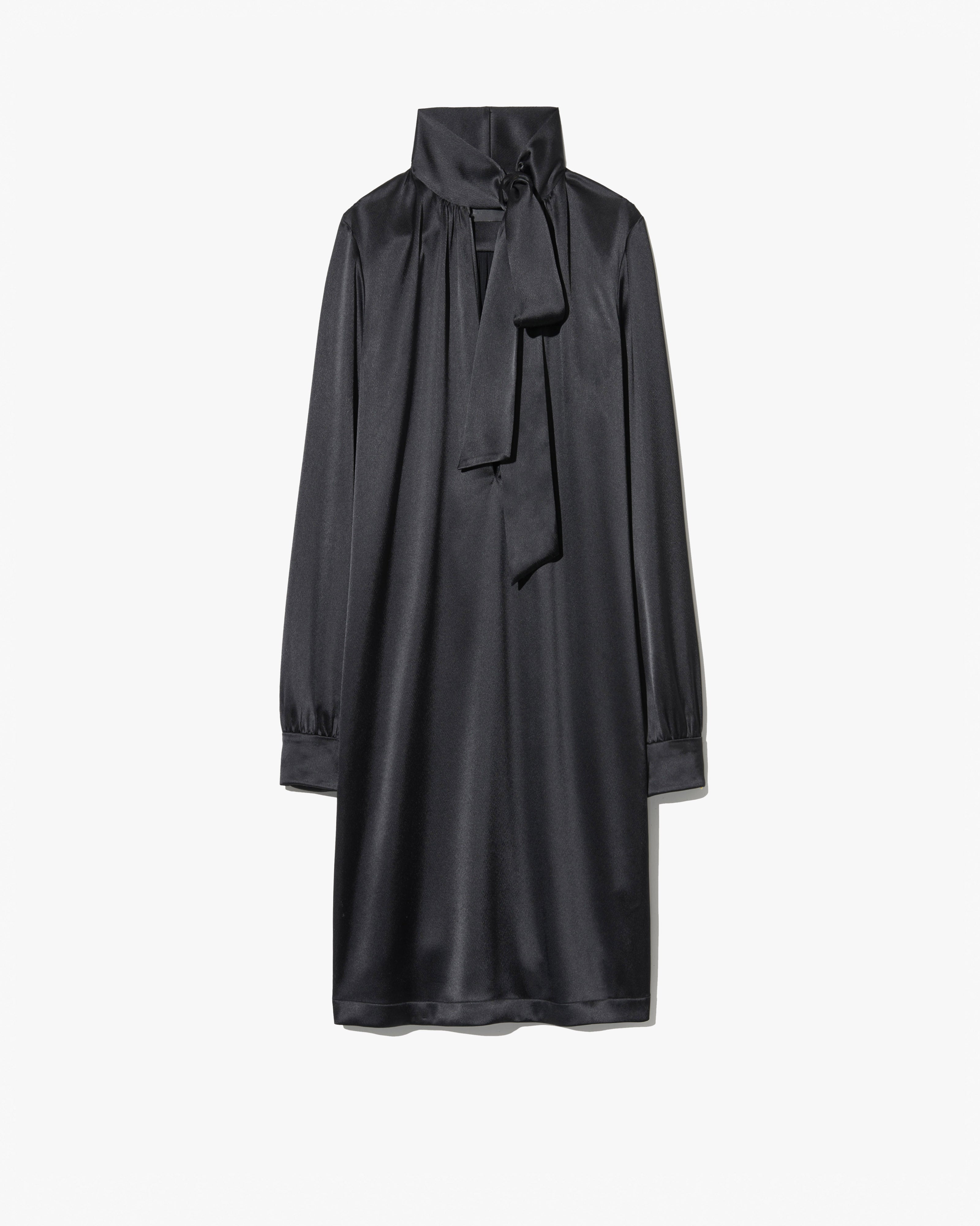 Short mini dress. Plunging open slit with center front neck drop and tie neck. Buttons at cuffs with ruching and keyhole openings at sleeves. Back yoke detail with shirring. Straight hem. - Made in USA - 76% Triacetate 24% Polyester - Dry clean only