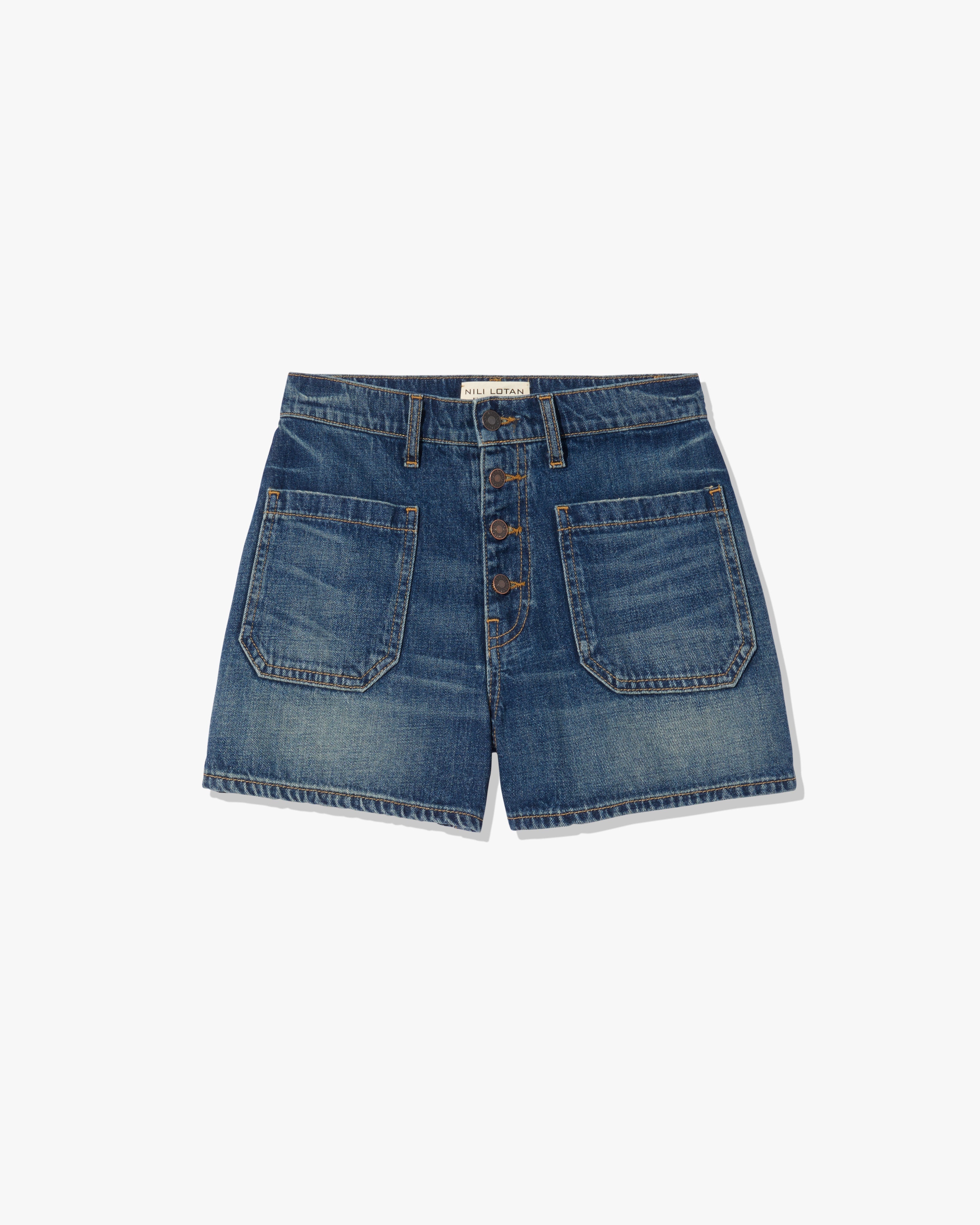 Slim mini short in Japanese non-stretch denim. Fitted through waist and hips. Exposed shank closure at center front. Front and back top stitched patch pockets. Back darts. Belt loops. Made in USA COMPOSITION & CARE 100% Cotton Machine wash cold Tumble dry low Medium iron Do not bleach Do not dry clean