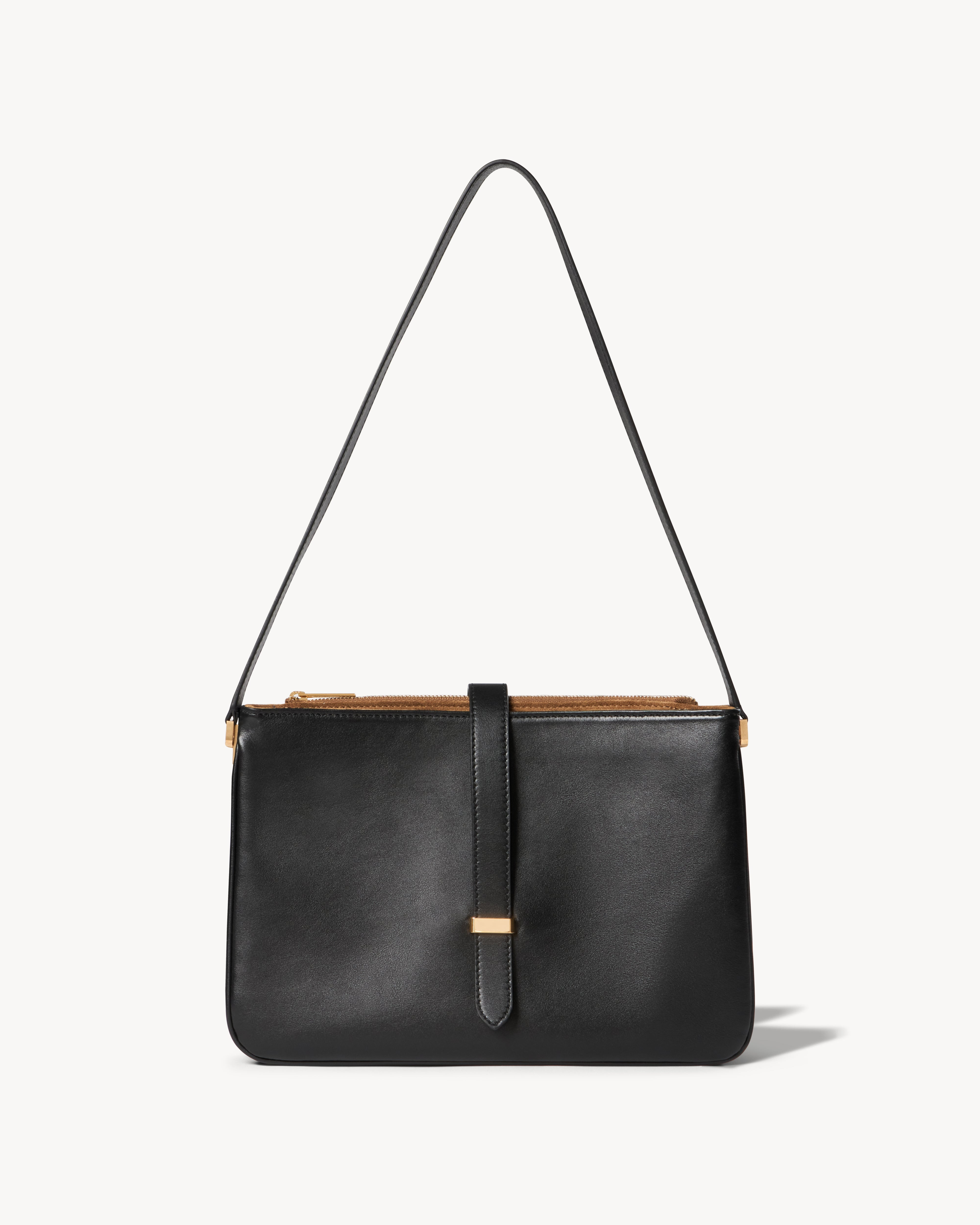 Shoulder bag in Italian smooth leather with Italian suede lining. Semi-structured silhouette with a soft handfeel and accordion gusset design. Triple-gusset construction. Back wall zip pocket and open front, middle, and back compartments. Leather strap extends from back to front, sliding through a custom gold rectangle post for closure. Adjustable strap features. Signature buckle. No exterior logo. Interior debossed NILI LOTAN NEW YORK logo. Hardware includes custom rectangle post at exterior, logo zipper puller, and custom gusset hardware. Expertly crafted in Spain by master artisans. Exterior leather and interior suede are sourced from LWG-certified Italian tanneries committed to sustainable practices. All hardware is nickel-free, hand-plated in a custom gold finish developed exclusively for Nili Lotan. Dimensions (inches): 7.5” Height , 10.75” Length , 2” Depth , 11” Shoulder Drop - Smooth Calfskin - Professional leather care only
