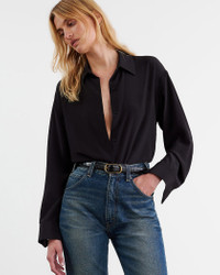 Oversized long-sleeved button-front shirt in fluid silk crepe de chine. Dropped shoulder. Spread collar. Shirred back yoke. Curved shirttail hem. Minimally styled with clean front and tonal buttons. Made in USA SIZE & FIT Model wears size S. For exact measurements by size, view our size guide. COMPOSITION & CARE 100% SILK, MADE IN USA OF IMPORTED FABRIC DRY CLEAN ONLY LOW IRON