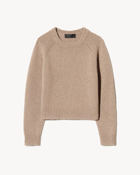 Long sleeve crewneck pullover sweater in a cashmere wool blend. Medium weight in jersey stitch. Shrunken fit. Short length. Regular length raglan sleeve. 1x1 rib at hem and cuff. Neck trim in 1x1 rib. Fashioning at armhole and sleeve. Signature center back cable knit detail. - 50% Cashmere 50% Virgin Wool - Dry clean recommended