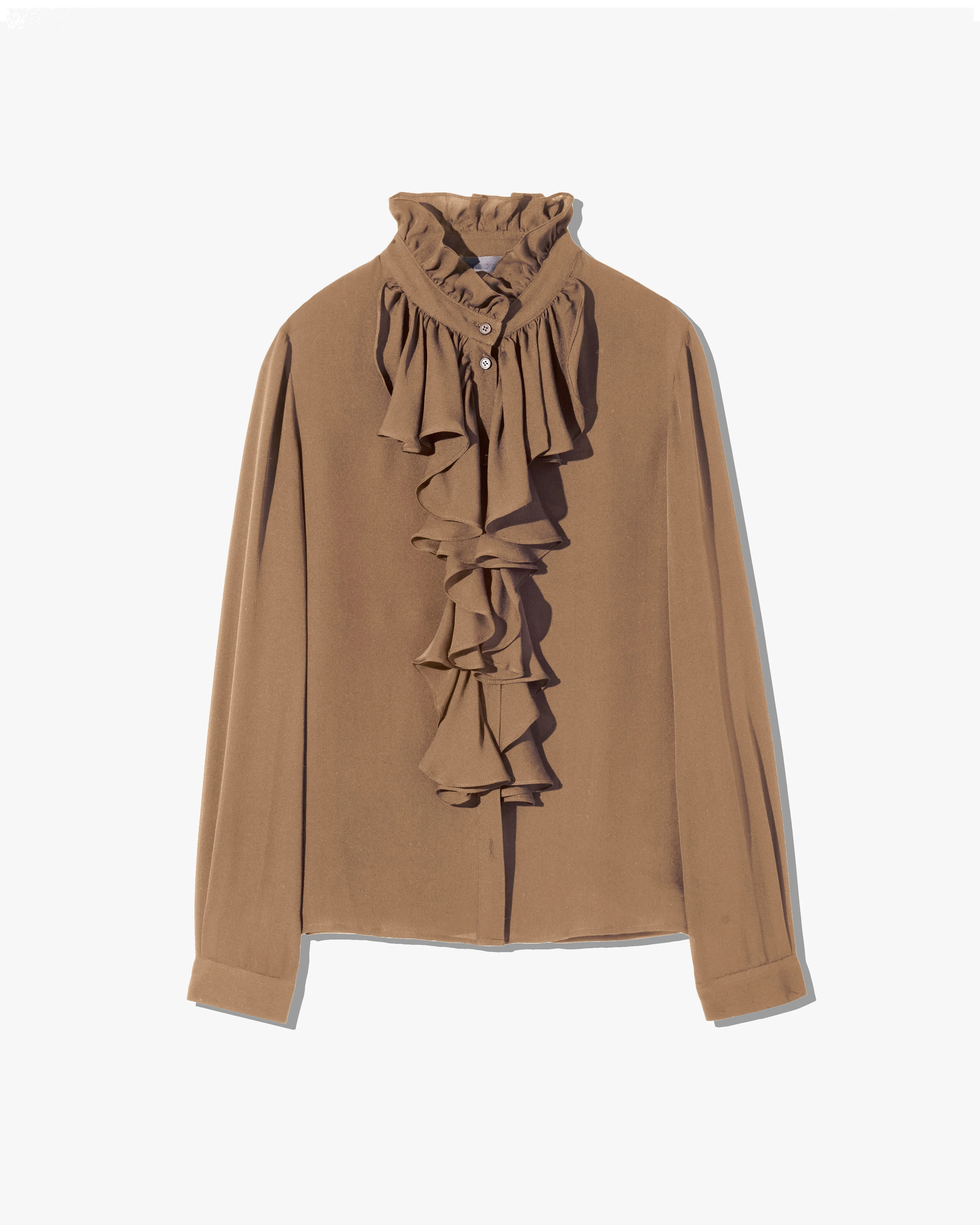 Blouse with ruffle collar and collar stand. Cascading ruffle detail at bib. Buttons at cuffs. Straight hem. Slightly sheer. - Made in USA - 100% Silk - Dry clean only - Low iron