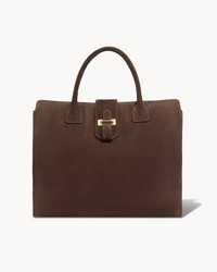 Top-handle bag in Italian suede. Semi-structured silhouette with a soft handfeel that collapses intentionally over time. Structured base. Removable interior strap allows for shoulder or crossbody wear. Removable interior pouch. Interior back wall zip pocket. No exterior logo. Interior debossed NILI LOTAN NEW YORK “Made In” logo. Hardware includes logo zipper pullers at back wall pocket and removable pouch, custom-designed hardware at front, D-ring and dog clip closure at interior, and metal feet at base of bag. Expertly crafted in Italy by master artisans. Exterior leather is sourced from LWG-certified Italian tanneries, emphasizing sustainable practices. Interior suede is developed specifically for high-end lining. All hardware is nickel-free, hand-plated in a custom gold finish created exclusively for Nili Lotan. Dimensions (Inches): 12” Height , 14” Length , 5.5” Depth , 5” Handle Drop , 15.5” Shoulder Drop - Italian Suede - Professional leather care only