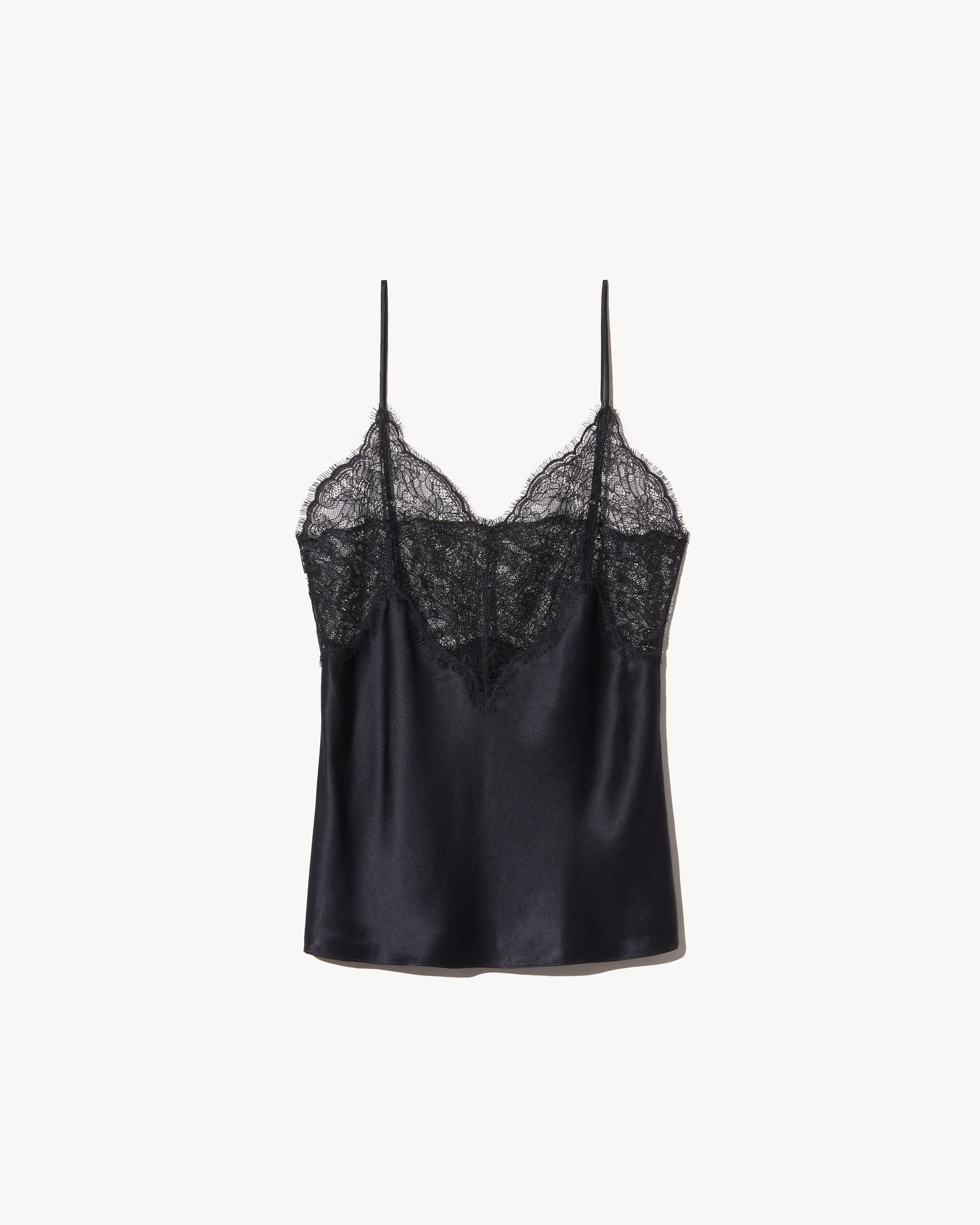 Sheer lace panel top. Scalloped edges. Adjustable slide straps. Charmeuse silk panel with eyelash trim. COMPOSITION & CARE 100% Silk Dry clean only Low iron