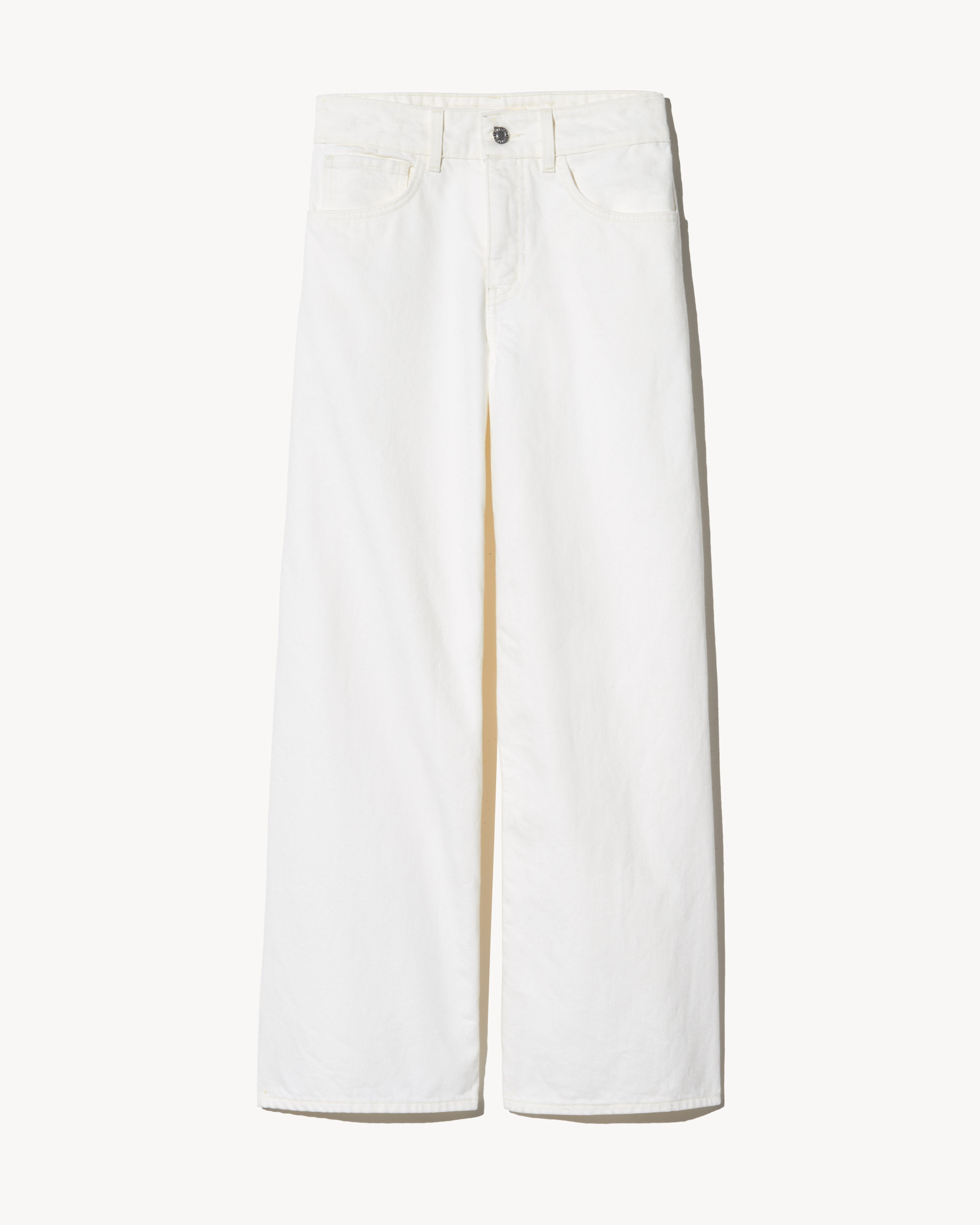 Mid-rise cropped wide leg jean in Japanese stretch denim. Fitted through waist and hips. Cropped ankle length. Five pocket details. Zip fly. Shank closure. Side seam. Belt loops. Designed for a 28" inseam. Made in USA COMPOSITION & CARE 100% Cotton Machine wash cold Tumble dry low Medium iron Do not bleach Do not dry clean