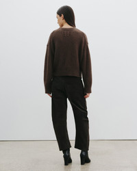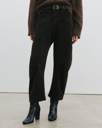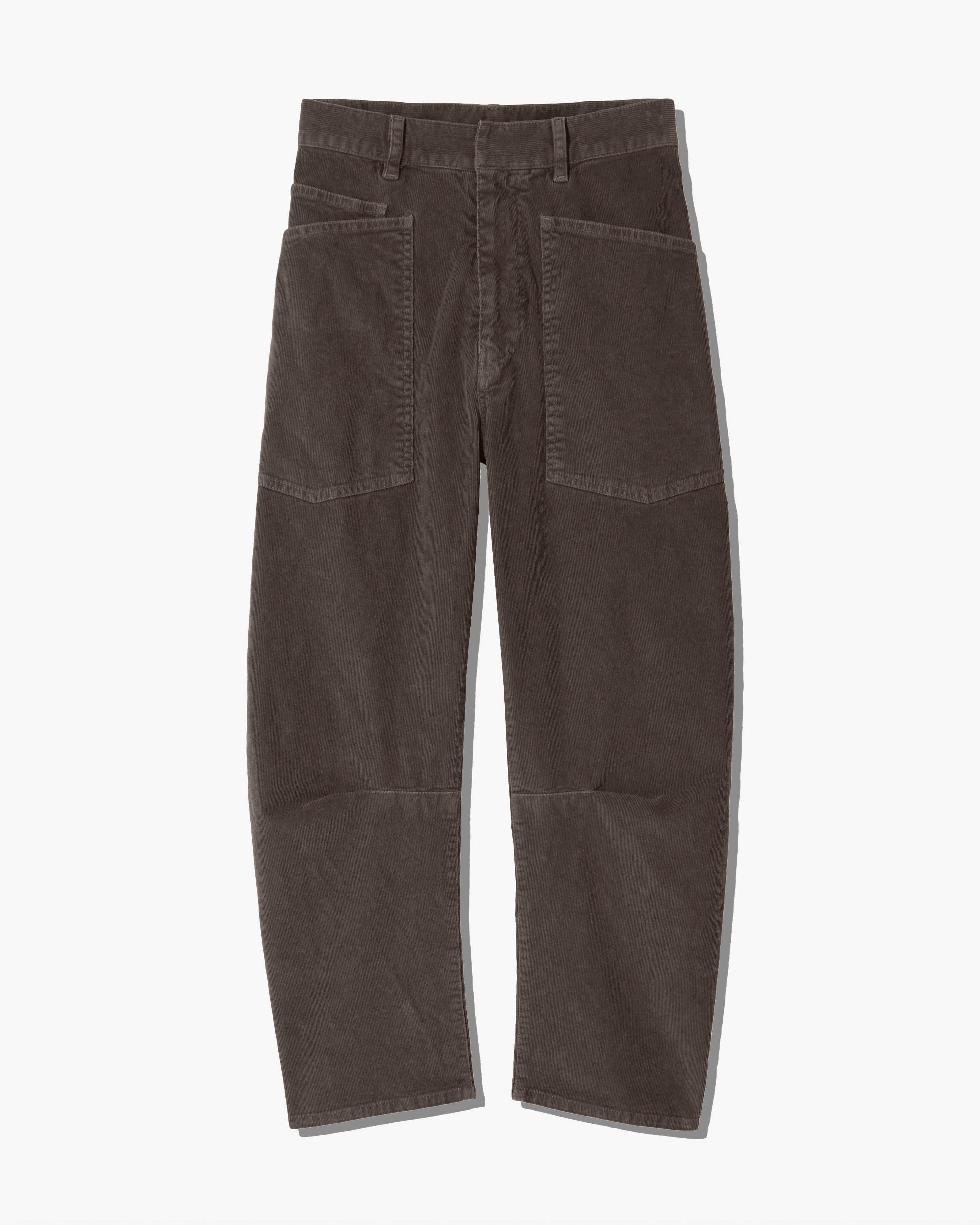 Mid-rise, relaxed fit barrel leg pant. Uniquely curved silhouette. Seam detail at knees. Gusset at inseam. Zip fly. Hidden hook-and-bar closure. Hidden stay button closure. Top-stitched front and back patch pockets. Belt loops. Designed for a 26.3" inseam. - Made in USA - 93% Cotton, 6% Polyester, 1% Polyurethane - Do not bleach - Machine wash cold - Tumble dry low - Low iron - Do not dry clean