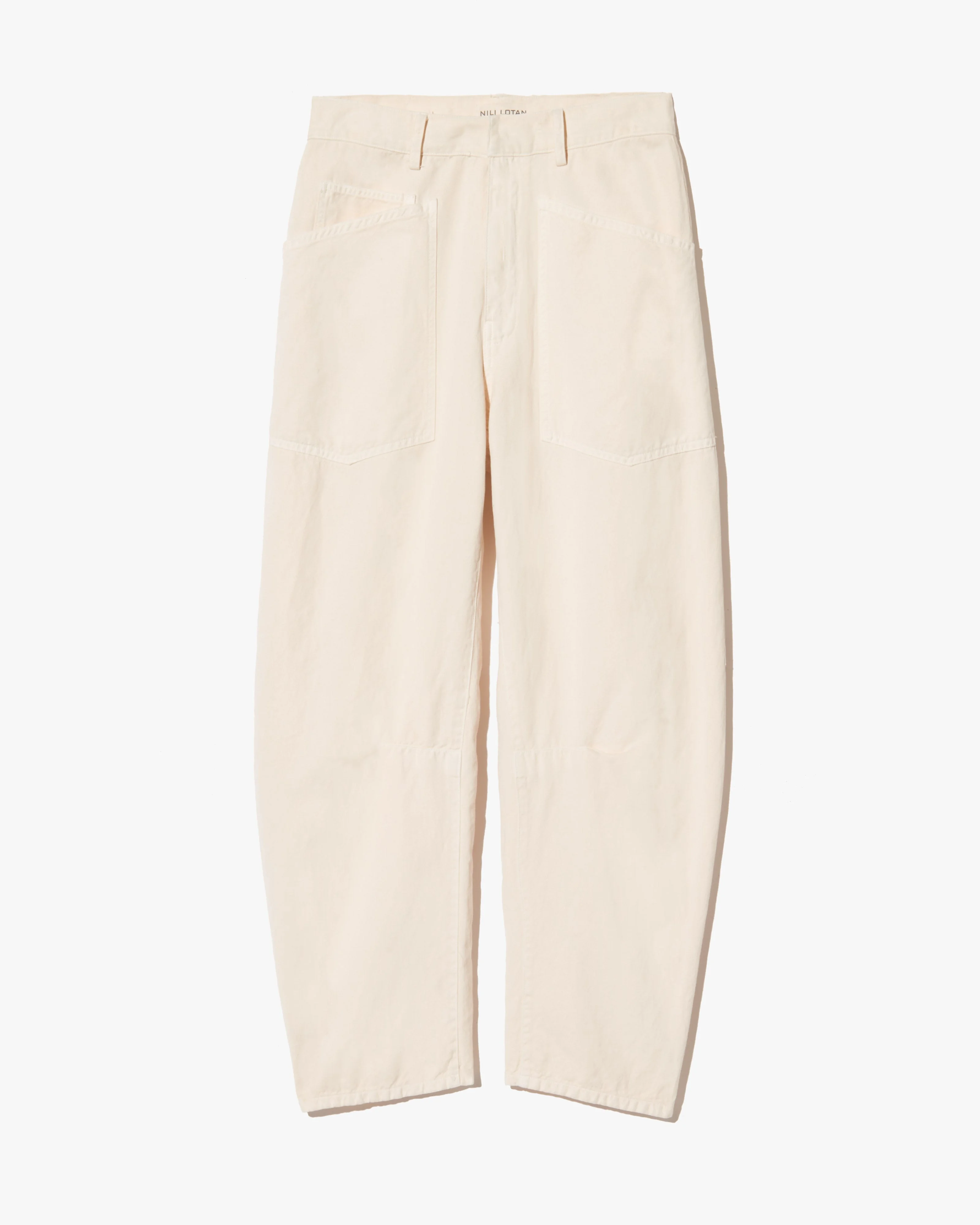 Mid-rise, relaxed fit barrel leg pant. Uniquely curved silhouette. Seam detail at knees. Gusset at inseam. Zip fly. Hidden hook-and-bar closure. Hidden stay button closure. Top-stitched front and back patch pockets. Belt loops. Designed for a 26.2" inseam—tailor for a personalized fit. COMPOSITION & CARE 77% Cotton, 23% Linen Do not bleach Do not tumble dry Low iron Dry clean