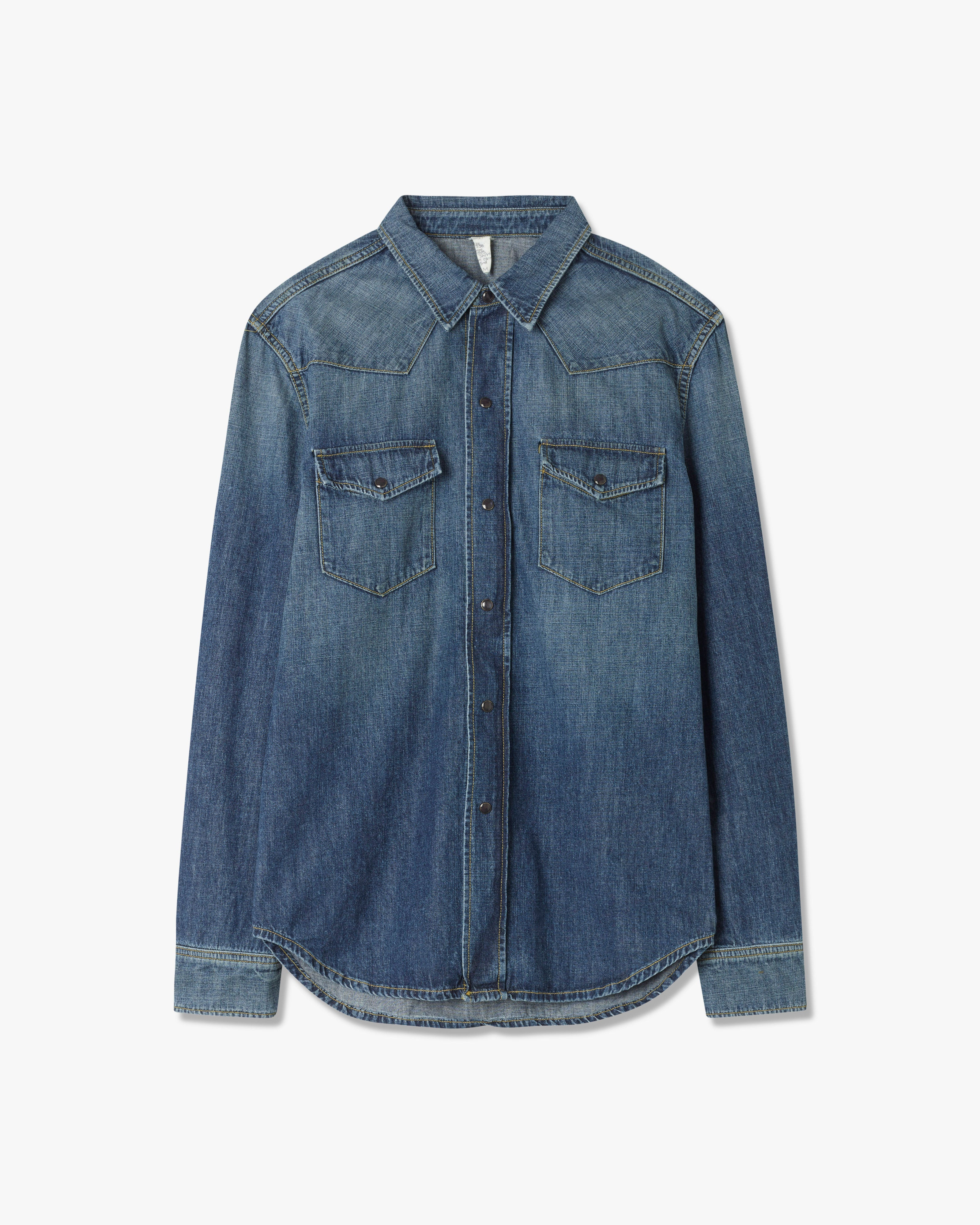 The Travis Shirt is a classic button-up rendered in a soft stretch denim. Wear on its own or layered over a tee. Complete with snap buttons for closure. Style: 11758W46 Made in USA SIZE & FIT SIZE: MEDIUM: 28 1/4" Body Length, 18" shoulder width, 41" chest circumference, 33" sleeve length from high point shoulder COMPOSITION & CARE 100% COTTON / US MACHINE WASH COLD TUMBLE DRY LOW COOL IRON DO NOT BLEACH DO NOT DRY CLEAN