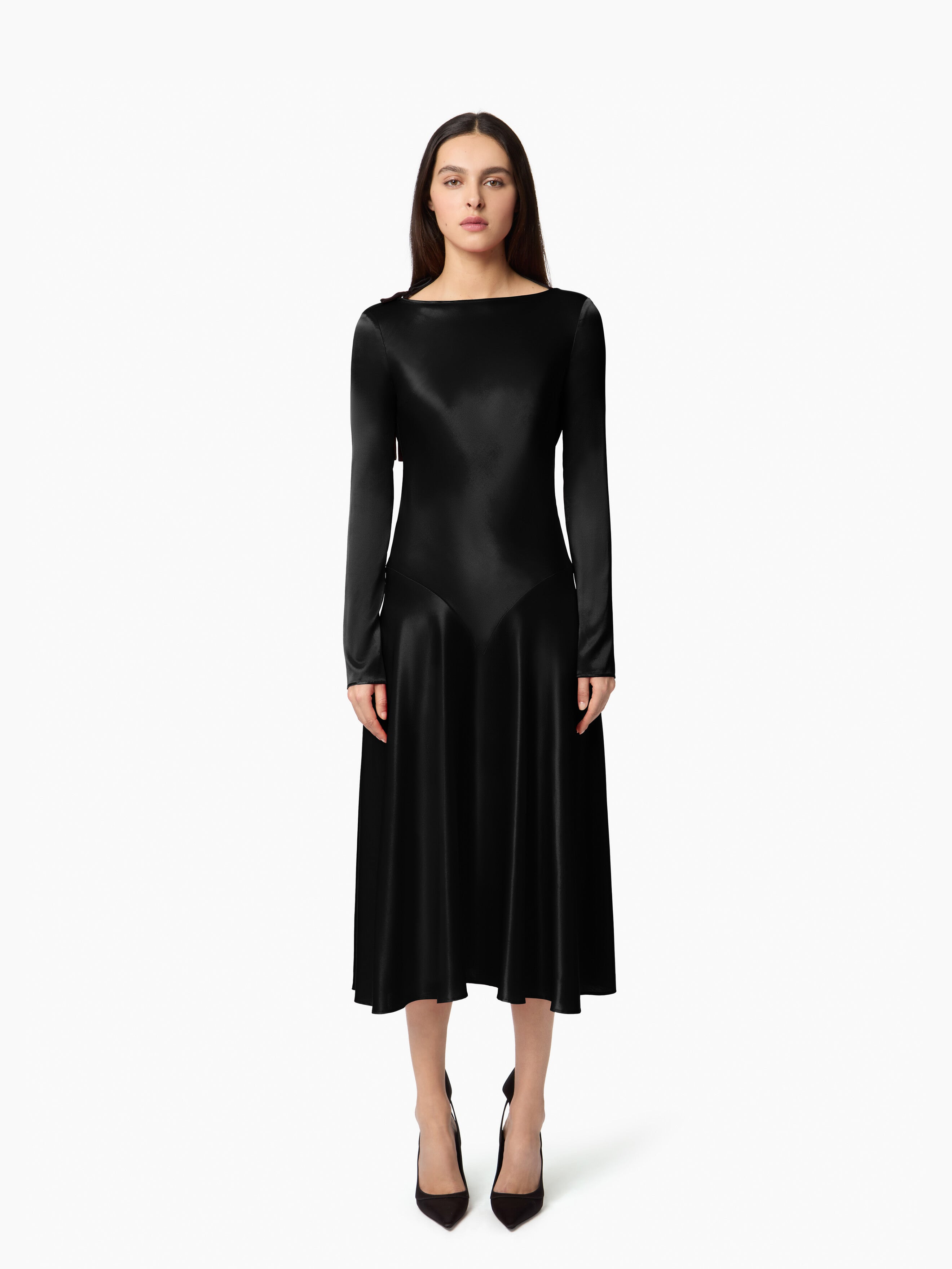 This black satin midi dress captivates with its elegant, fluid silhouette. Featuring long sleeves and an open back tied with a fine velvet ribbon, it showcases a bias cut that naturally follows the body’s curves. A sophisticated design, emblematic of the feminine elegance of Maison Nina Ricci. COMPOSITION & DETAILS - 52% viscose, 37% silk, 11% elastane. - Fitted cut. - Midi length. - Boat neckline. - Fine ribbon tie at the back. - Model is 180 cm/ 5ft 11in and wears a size 36 (FR). - Ref: 25ACRO050VI0530U9000