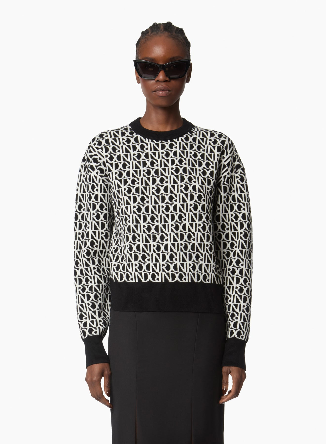 This crewneck sweater is crafted in intarsia with the NR monogram in cream on black—an iconic signature of the Nina Ricci wardrobe. The double-faced jacquard delivers equally refined definition inside and out, reflecting meticulous attention to detail. Ribbed trims at the neckline, cuffs, and hem subtly frame the silhouette while ensuring everyday comfort. COMPOSITION & DETAILS - 86% wool, 10% cashmere, 3% polyamide, 1% elastane. - Regular fit. - Crew neckline. - All-over NR monogram. - Contrast ribbed trims at collar, cuffs, and hem. - Model is 178 cm / 5ft 10in and wears size S. - Ref: 25AMPU016ML0587I1215