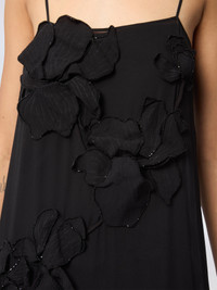 Sleek and sensual, this black silk dress features oversized tonal floral appliques, delicately embroidered with micro-beads for a subtle shimmer. Designed for the Spring-Summer 2026 collection, its minimal straps and fluid drape highlight the body with ease, while the hand-crafted flowers echo Nina Ricci’s heritage of romantic embellishment, reimagined through the dramatic lens of Harris Reed. A modern evening silhouette that speaks in whispers, yet holds the room. COMPOSITION & DETAILS - 100% silk. - Lined with a dress. - Model is 180 cm/ 5ft 11in and wears size 36 (FR). - Ref: 26PCRO032SE1417U9000