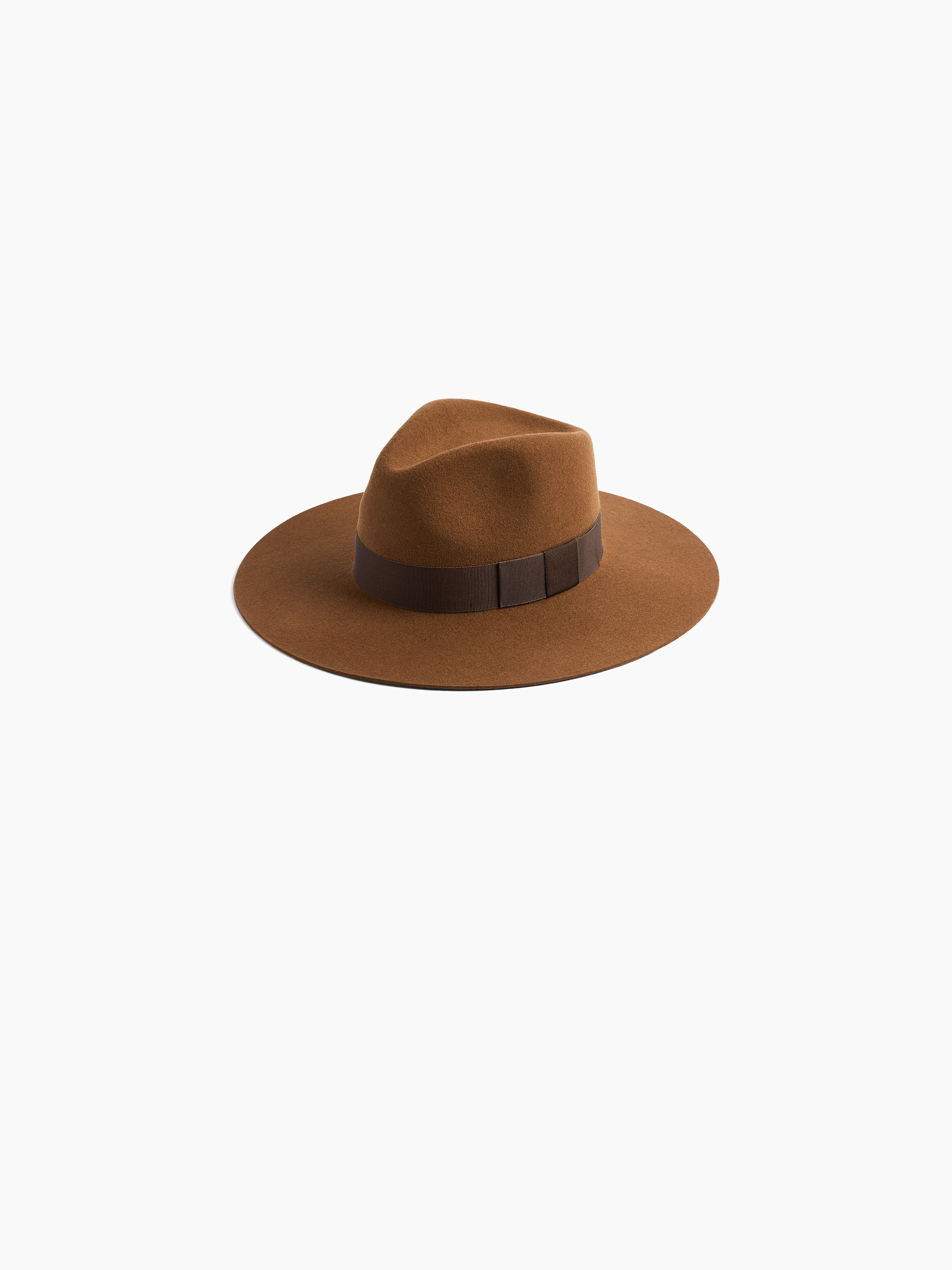 This chocolate brown wool felt fedora is elevated with a tonal grosgrain ribbon and signature bow detail—an iconic nod to Maison Nina Ricci. With its structured shape and refined finish, it adds timeless elegance to any silhouette. COMPOSITION & DETAILS - 100% wool. - Brim width: 9 cm. - Tonal grosgrain band with bow detail. - Available in 5 sizes. - Ref: 25AAA0158FEL025U7518