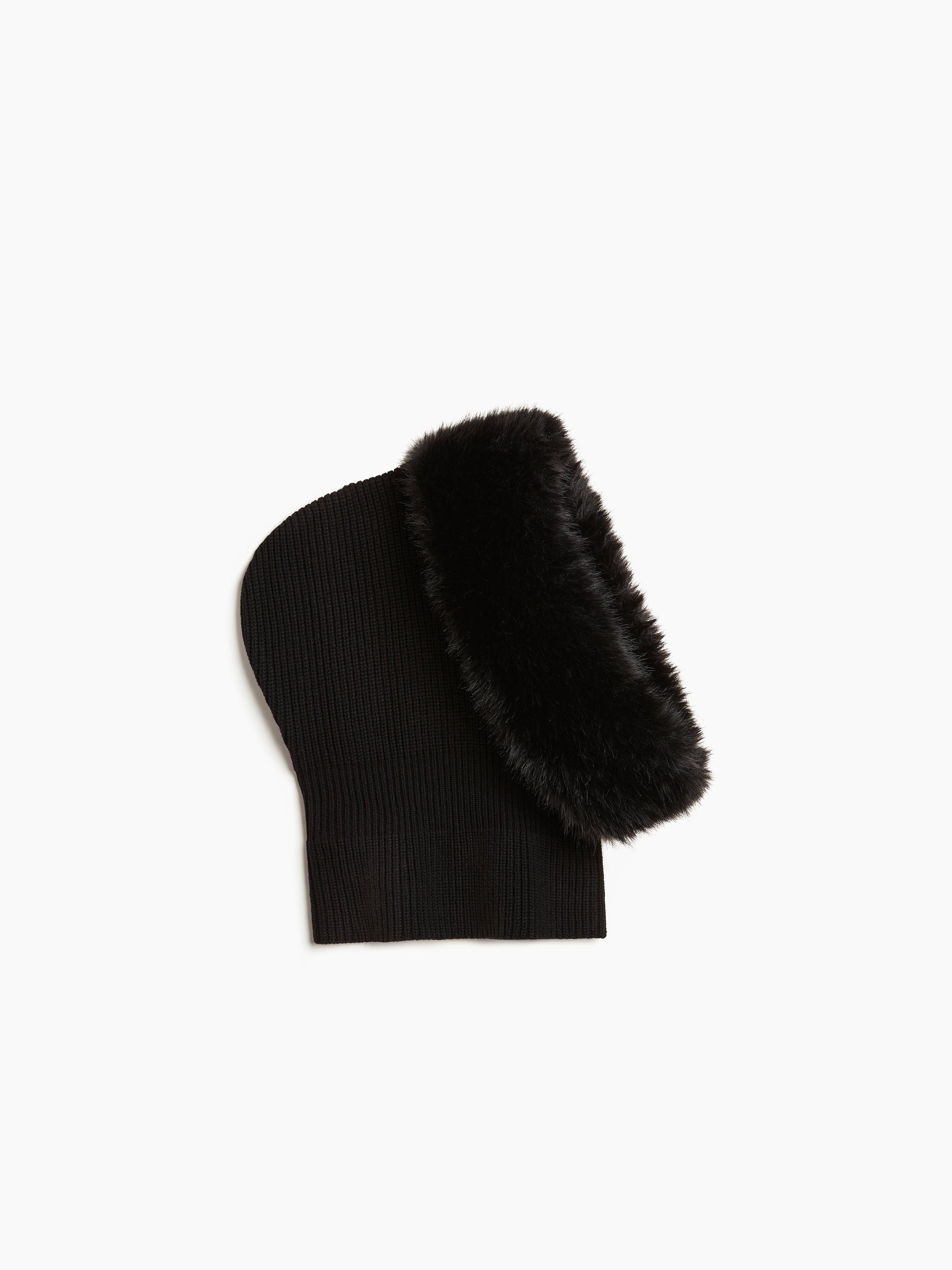 This ribbed wool and cashmere hood, trimmed with faux fur, introduces a new piece imagined by Harris Reed for Maison Nina Ricci. It combines warmth, comfort, and elegance, while adding a bold fashion twist. COMPOSITION & DETAILS - 90% wool, 10% cashmere. - Faux fur trim around the face. - One size fits all. - Ref: 25AMAC001ML0590U9000