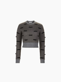 This heather grey sweater in mohair knit offers a perfect blend of softness and warmth. Made from a double-faced knit, it pairs a mohair outer layer with a wool interior for a cocoon-like feel. The design is embellished with hand-applied black contrast bows, adding a refined graphic accent. Ribbed trims at the neckline, cuffs, and hem introduce a subtle contrast and a sporty touch to this polished silhouette. Styled with the matching skirt, it completes a full Nina Ricci look. COMPOSITION & DETAILS - 86% wool, 7% mohair, 6% polyamide, 1% elastane. - Fitted cut. - Crew neckline. - Ribbed collar, cuffs, and hem. - Hand stitched contrast bows. - Model is 180 cm / 5ft 11in and wears size S. - Ref: 25AMPU010ML0585U9210