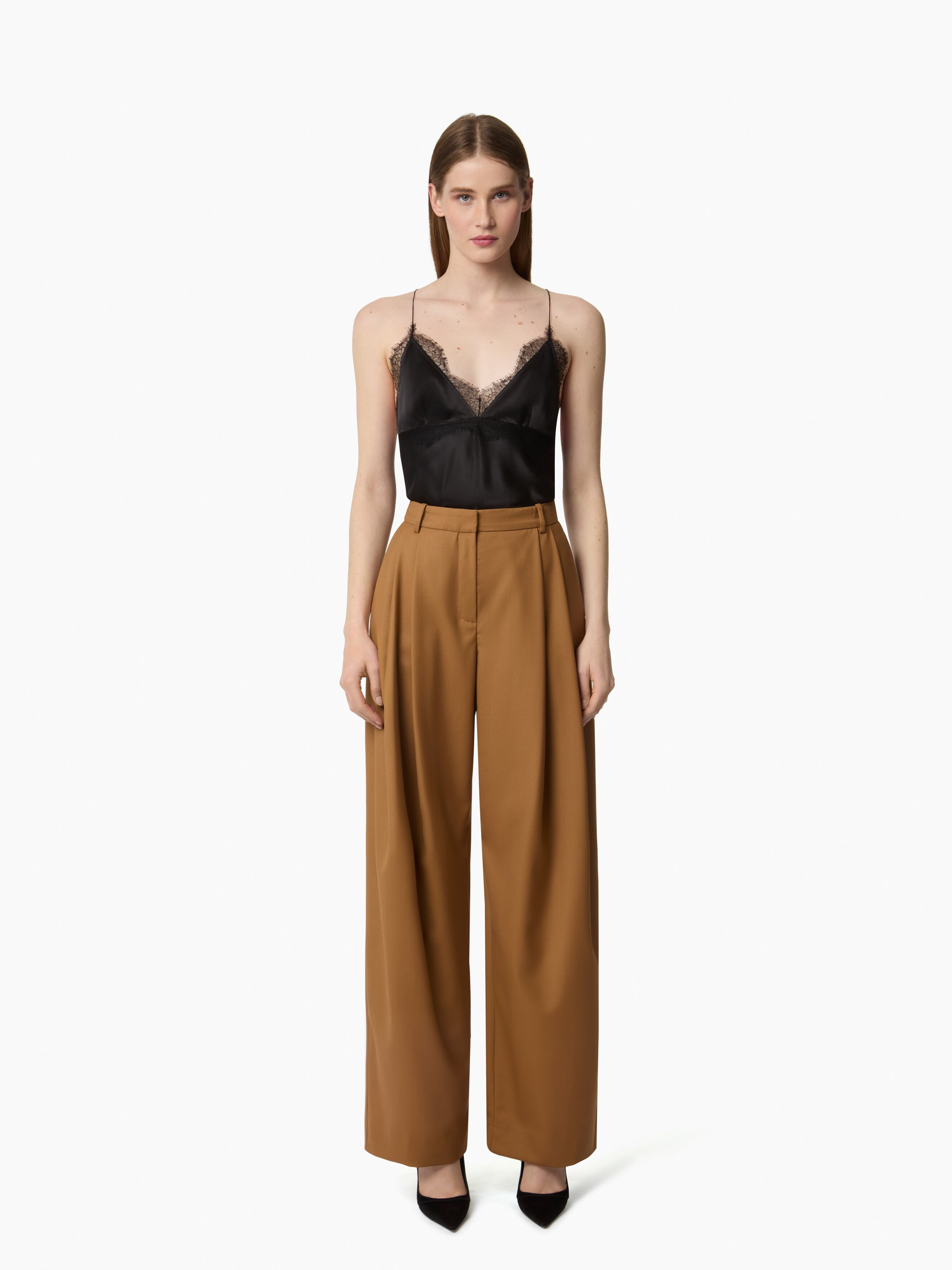 A signature of the Nina Ricci silhouette, tailoring is reimagined each season by Harris Reed with a modern sensibility. Crafted in warm tobacco-hued wool gabardine, these extra-wide trousers feature a sharp crease down the leg, creating a fluid, sculptural drape. The high waist and bold volume flatter the figure with refined elegance. Worn with the matching tailored jacket from the Fall-Winter 2025 collection, they deliver a bold, couture-infused look true to the Maison’s spirit. COMPOSITION & DETAILS - 100% virgin wool. - Wide-leg fit. - Belt loops. - Concealed closure. - 2 slanted pockets. - Model is 178 cm/ 5ft 10in and wears a size 36 (FR). - Ref: 25ACPA002WV0324U7403.